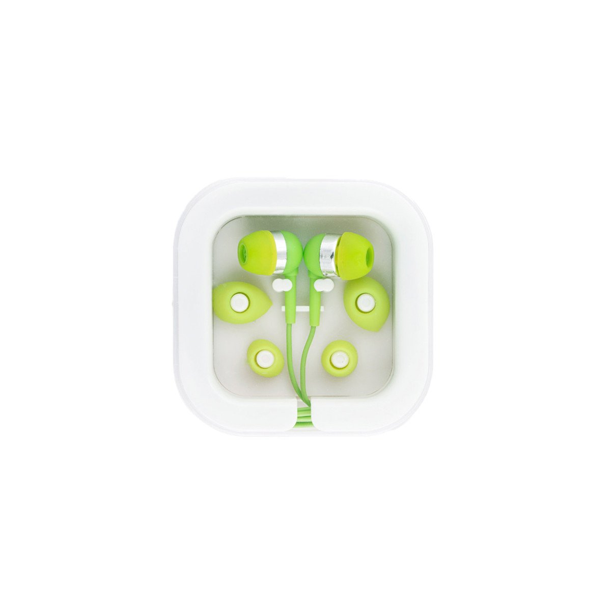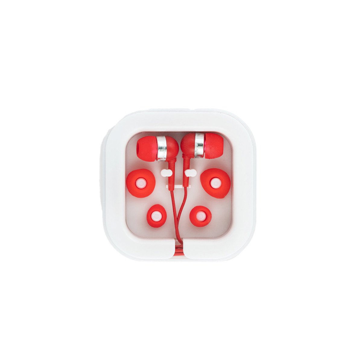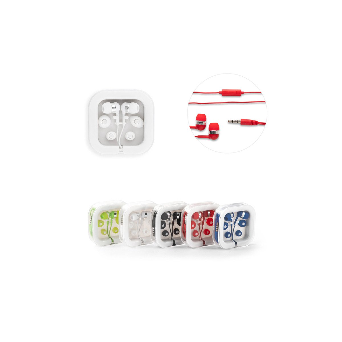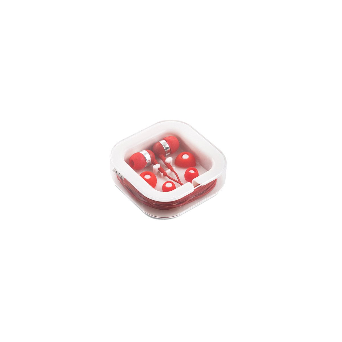 Auriculares de 120 cm con micrófono incorporado. Cuenta con conexión estéreo de 3,5mm. Incluye 2 pares adicionales de adaptadores de silicona para los oídos (dos tamaños diferentes). Se suministra en caja de PS y ABS. Medidas: 7 x 7 x 1,8 cm