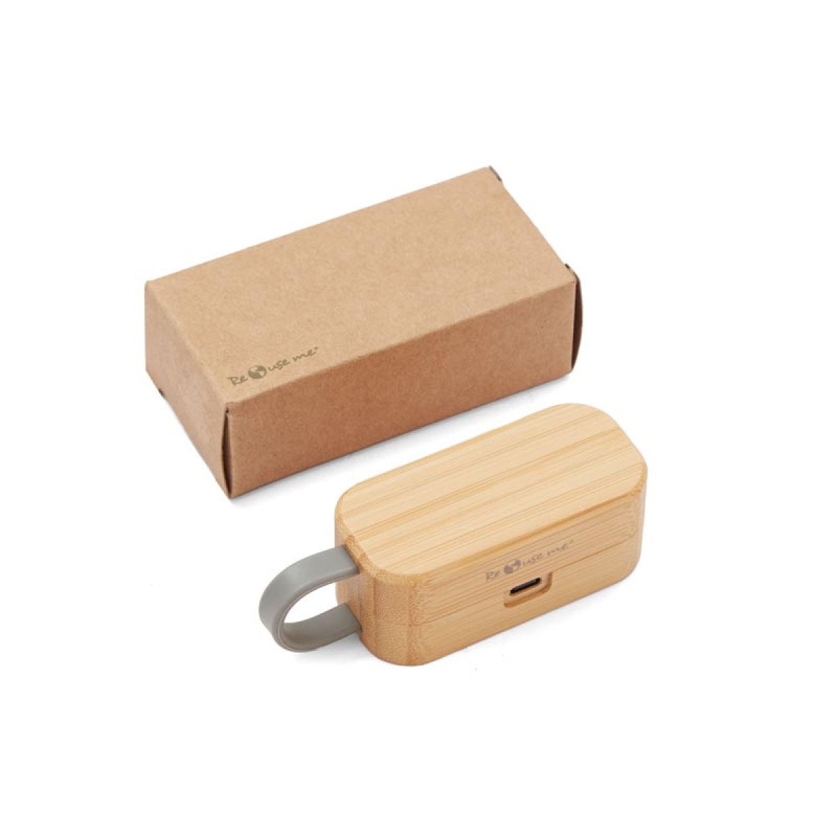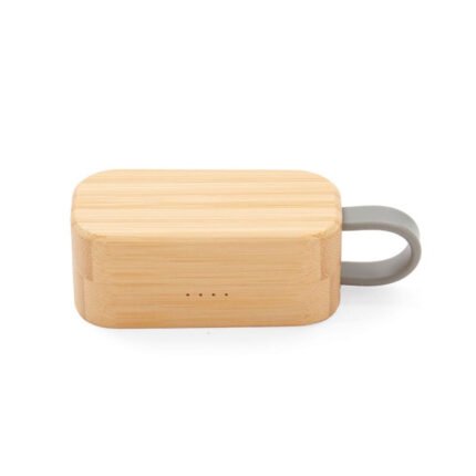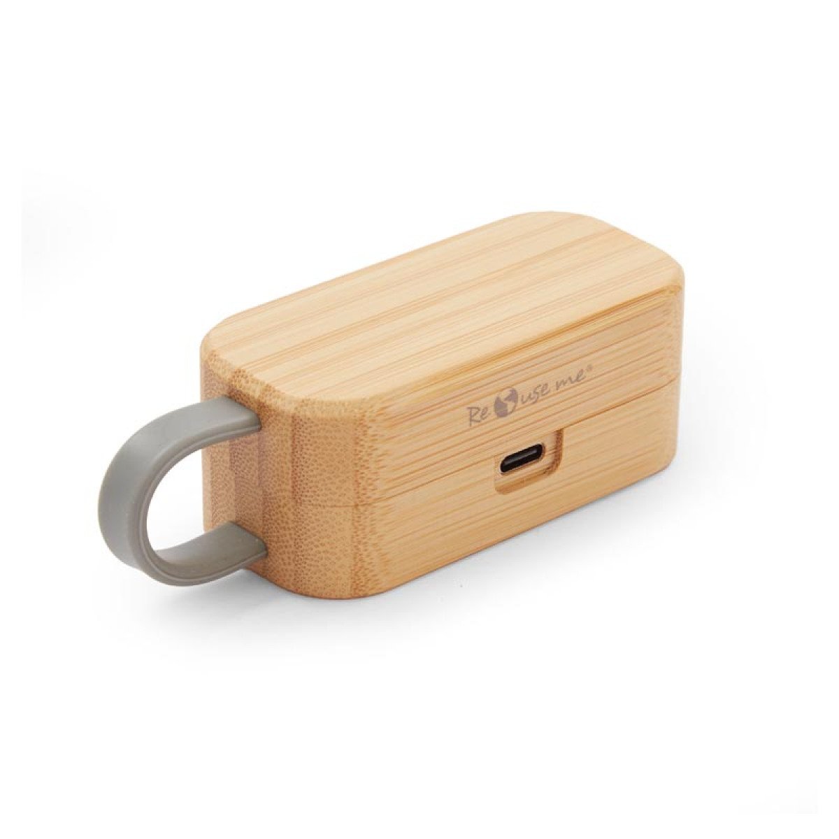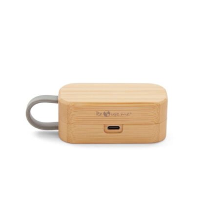 Auriculares inalámbricos con estuche de carga y micrófono incorporado. Posee tecnología bluetooth 5.0. La capacidad de carga es de 300mA y su duración en funcionamiento es de 3-5 horas seguidas. Estuche fabricado en ABS, bamboo y silicona gris, incluye cable. Medidas: 9,5 x 3,5 x 3,5 cm. ReUseMe.