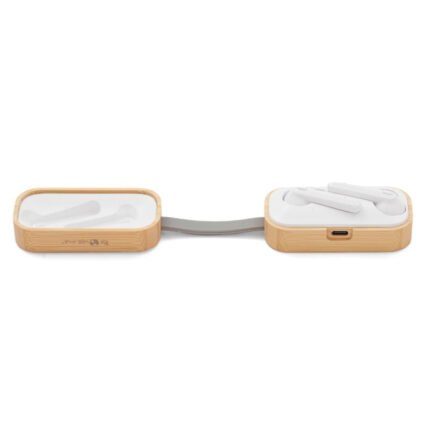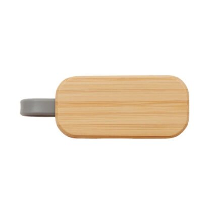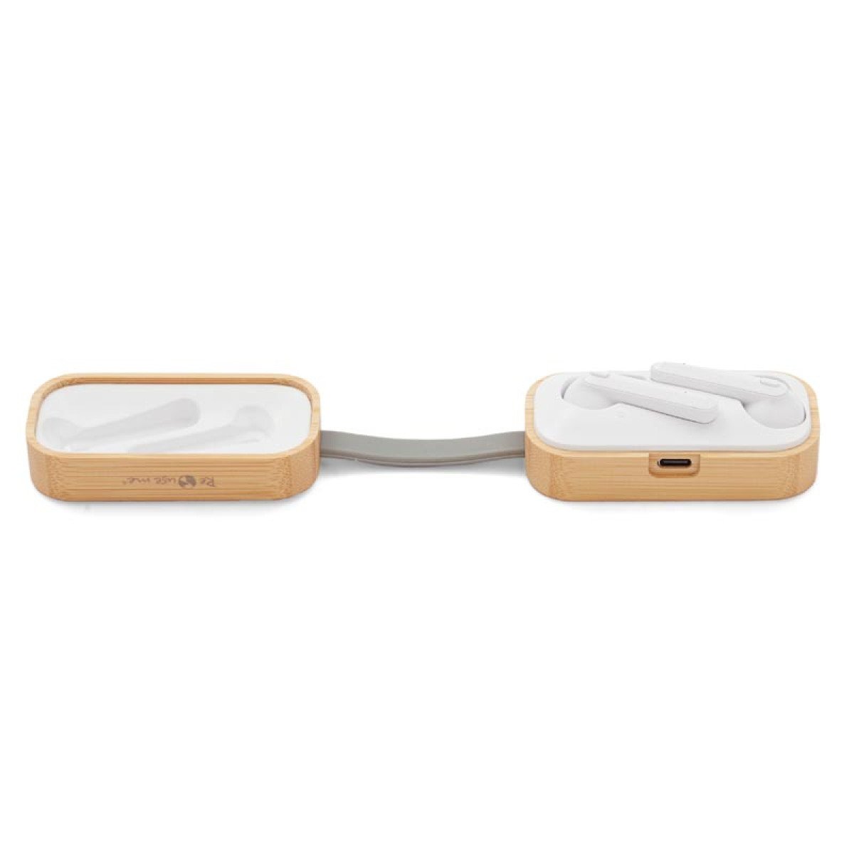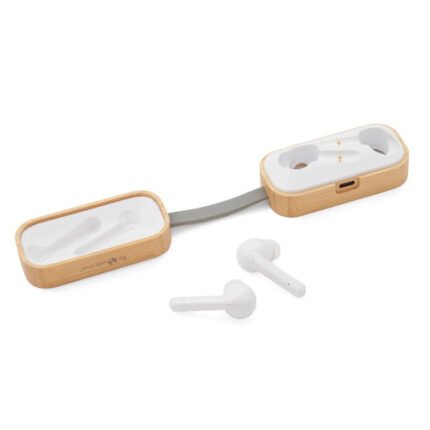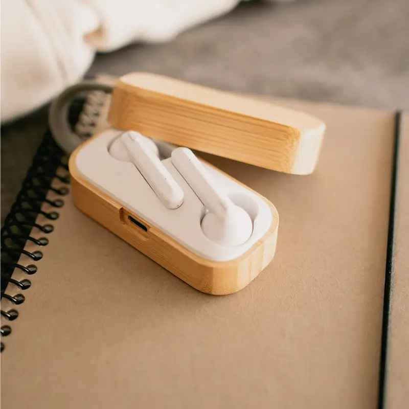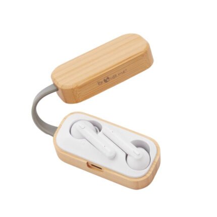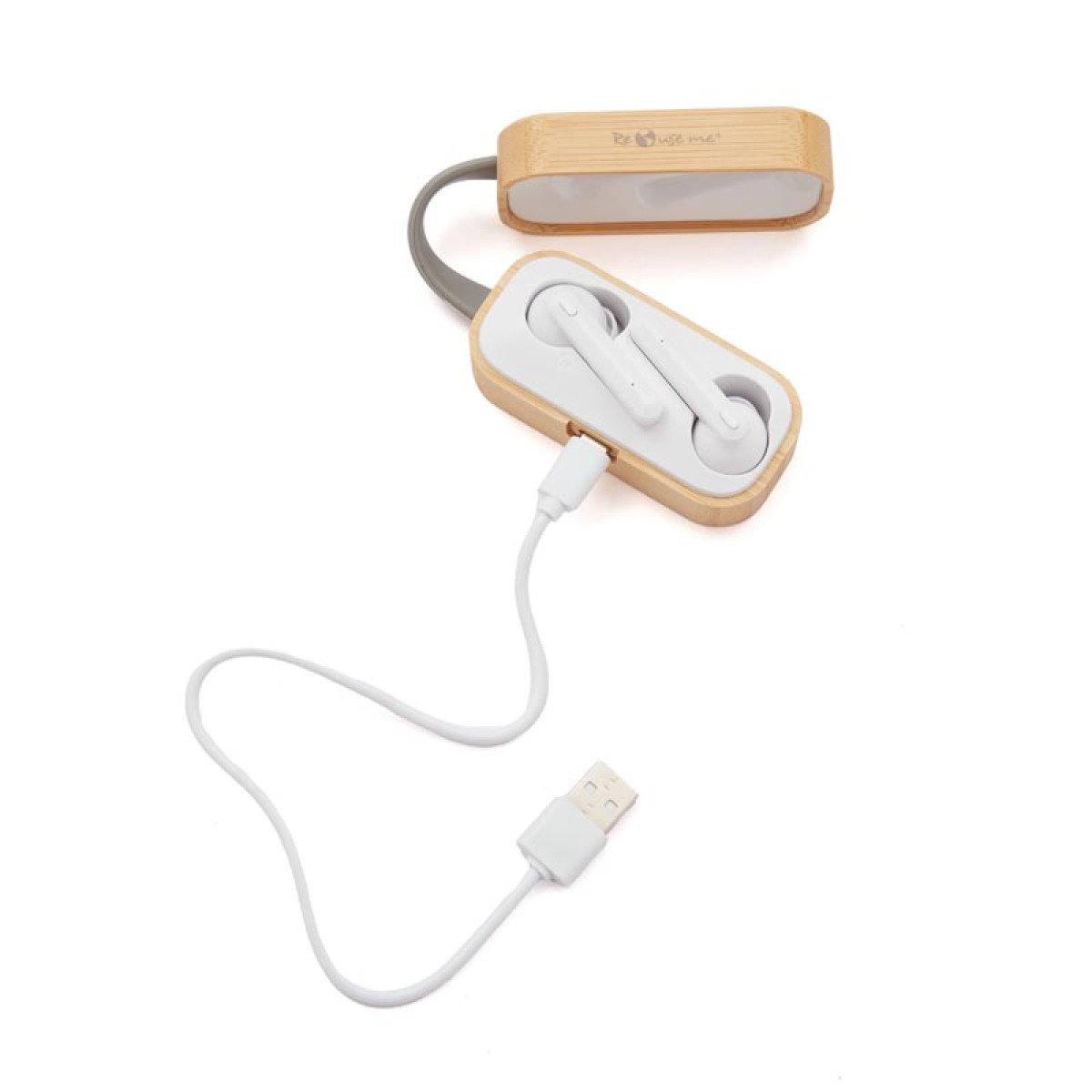 Auriculares inalámbricos con estuche de carga y micrófono incorporado. Posee tecnología bluetooth 5.0. La capacidad de carga es de 300mA y su duración en funcionamiento es de 3-5 horas seguidas. Estuche fabricado en ABS, bamboo y silicona gris, incluye cable. Medidas: 9,5 x 3,5 x 3,5 cm. ReUseMe.