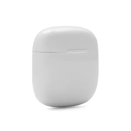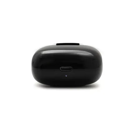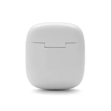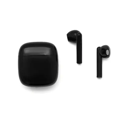 Auricular Bluetooth universal con micrófono incluido y estuche de carga. Está disponible en los colores blanco y negro e incluye un cable cargador USB. El estuche de carga cuenta con indicadores LED y botones de control táctil en ambos auriculares.