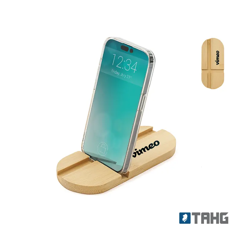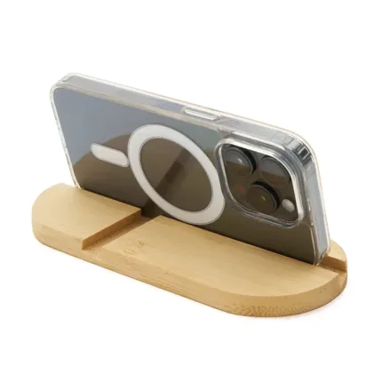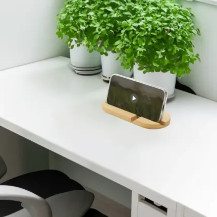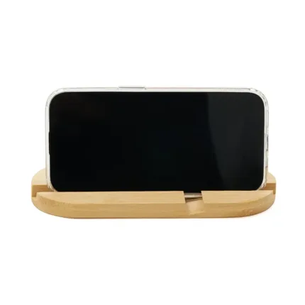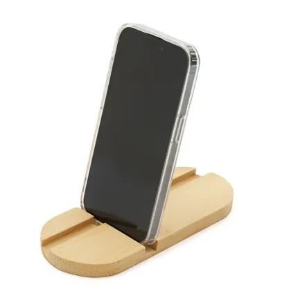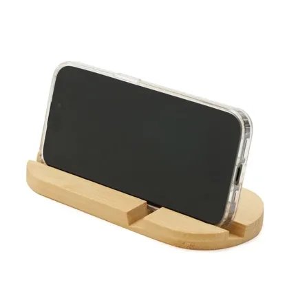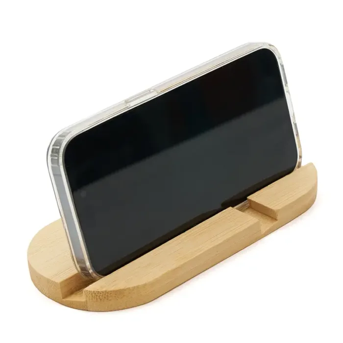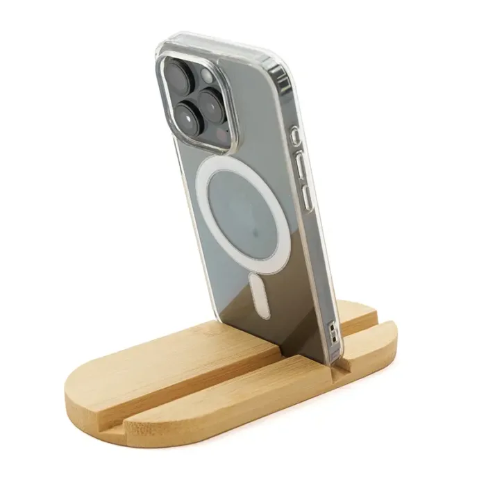 Soporte de escritorio fabricado en bambú, diseñado para adaptarse tanto a teléfonos como a tablets. Compacto, liviano, práctico y fácil de transportar, es el accesorio perfecto para mantener tu dispositivo estable mientras realizas videollamadas, ves contenido o trabajas cómodamente, tanto en casa como fuera de ella.