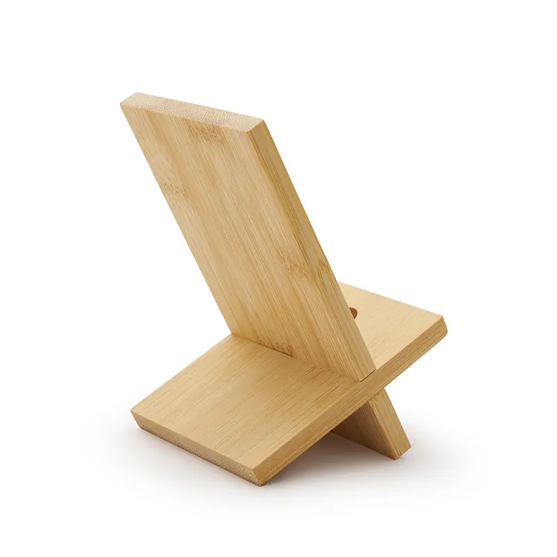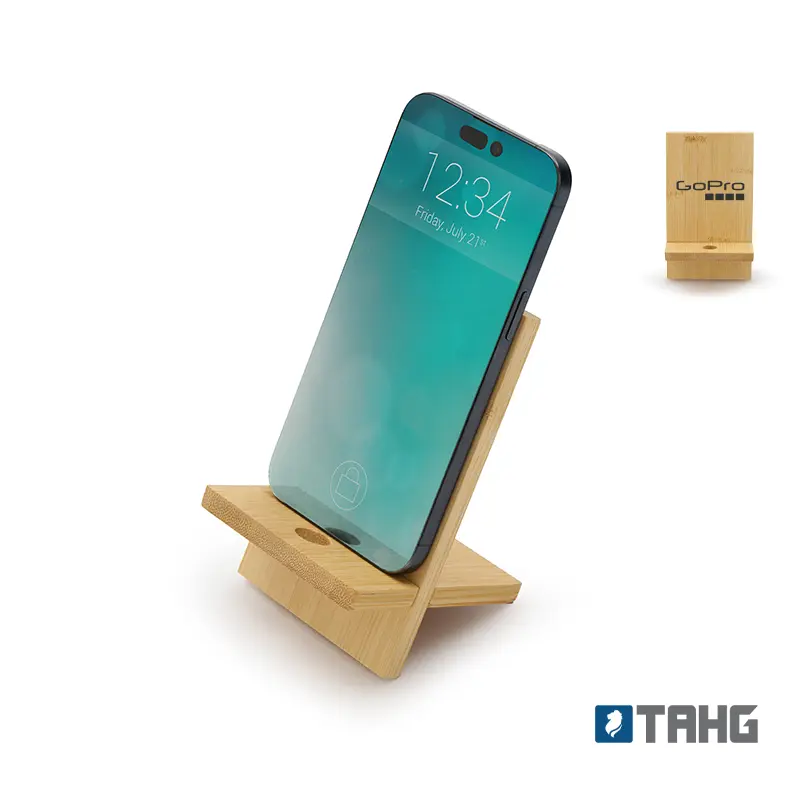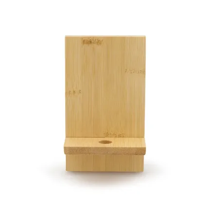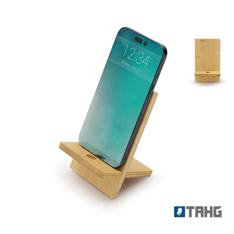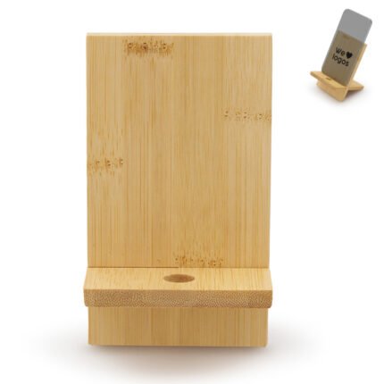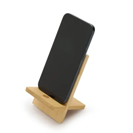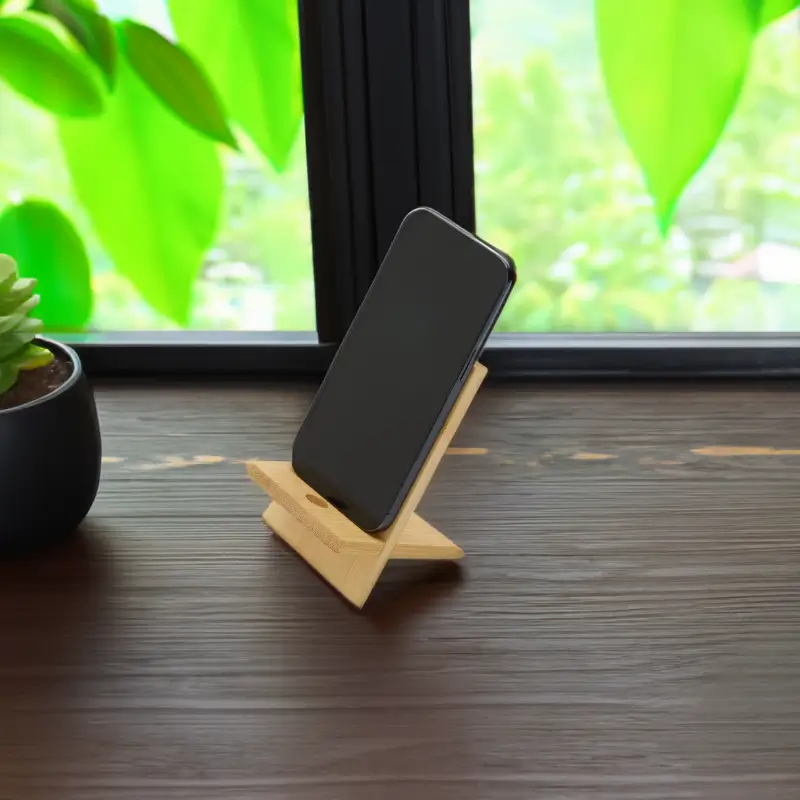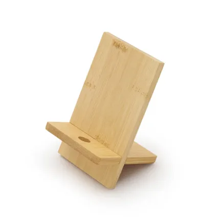 Soporte para teléfono fabricado en bambú. Práctico, liviano y fácil de transportar, es el accesorio perfecto para mantener tu dispositivo estable mientras realizas videollamadas, ves contenido o trabajas cómodamente, tanto en casa como fuera de ella. Además, incluye un orificio que permite el paso del cable facilitando la carga del dispositivo mientras está en uso.