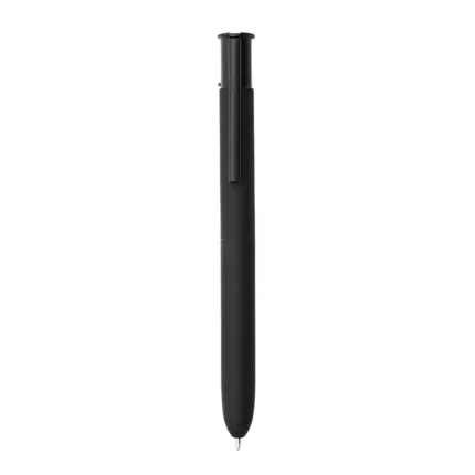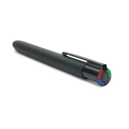 Bolígrafo retráctil de 4 colores fabricado en aluminio reciclado. Hecho con cuerpo de aluminio reciclado, cuenta con un barril ancho para mayor comodidad al escribir, clip plástico resistente y recargas de tinta alemana en negro, azul, rojo y verde que garantizan una escritura fluida y duradera. Es ideal para estudiantes, profesionales y oficinas que buscan un instrumento de escritura práctico, elegante y sostenible.