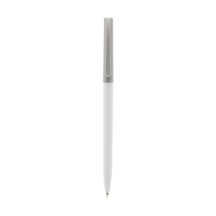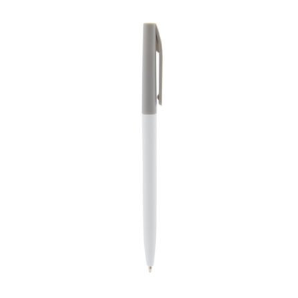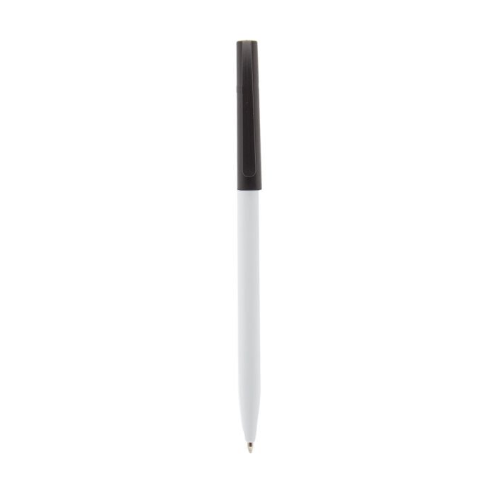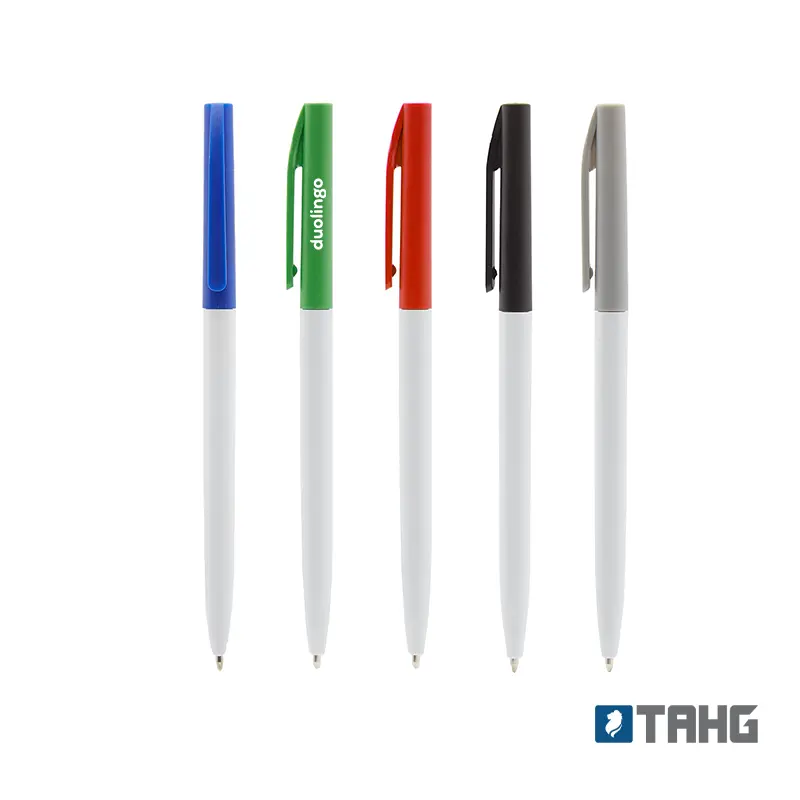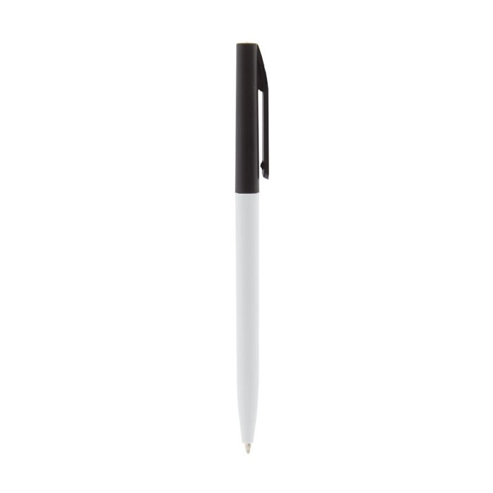 Bolígrafo con cuerpo plástico blanco. Clip de color. Apertura de medio giro. Tinta negra. Tahg
