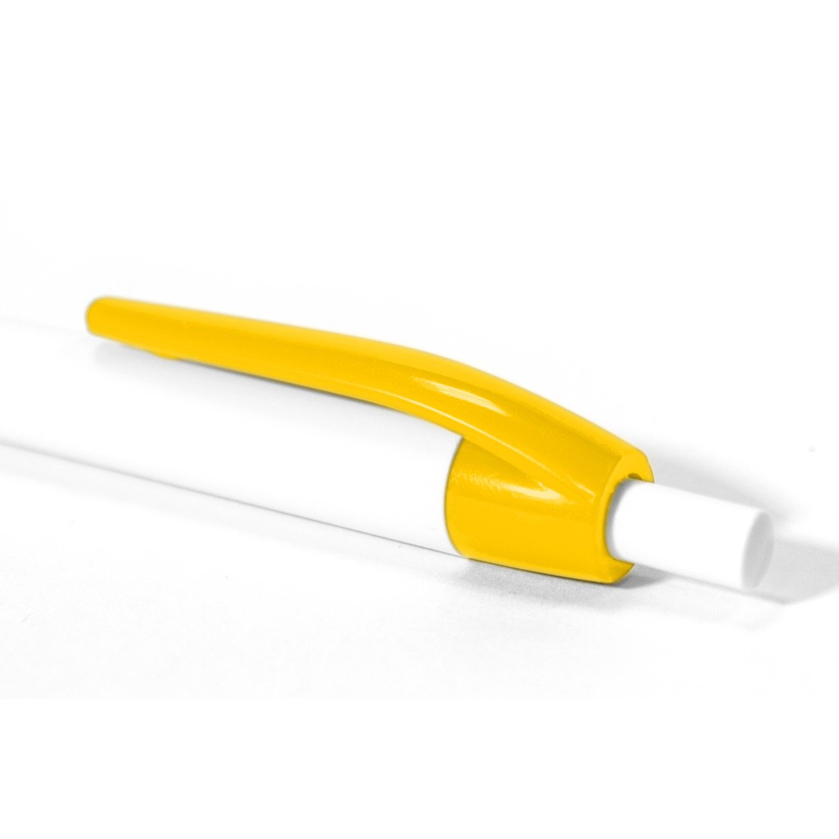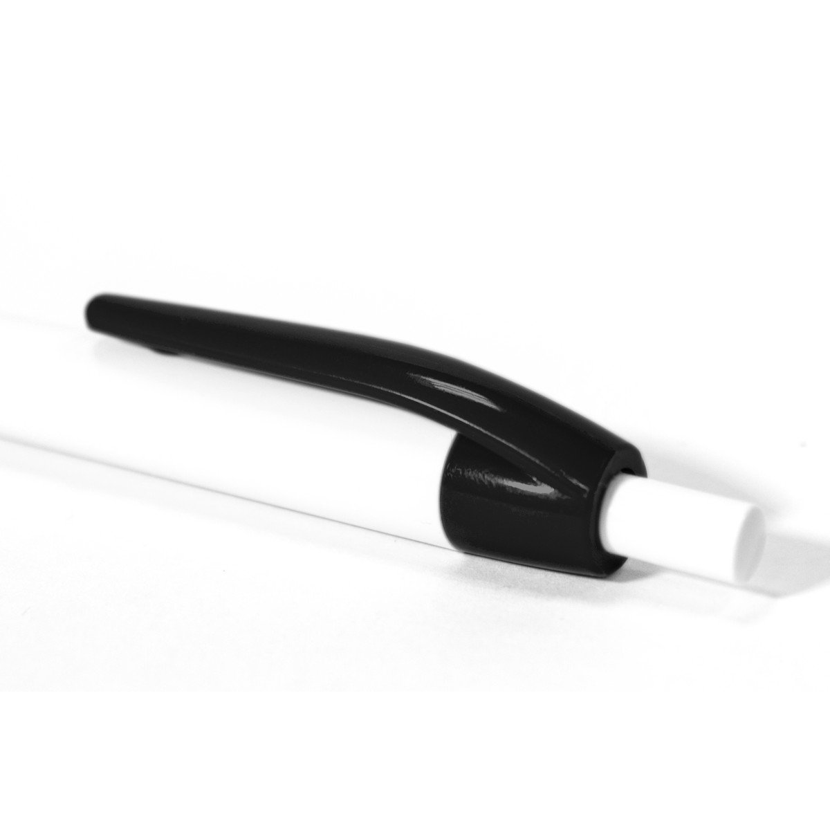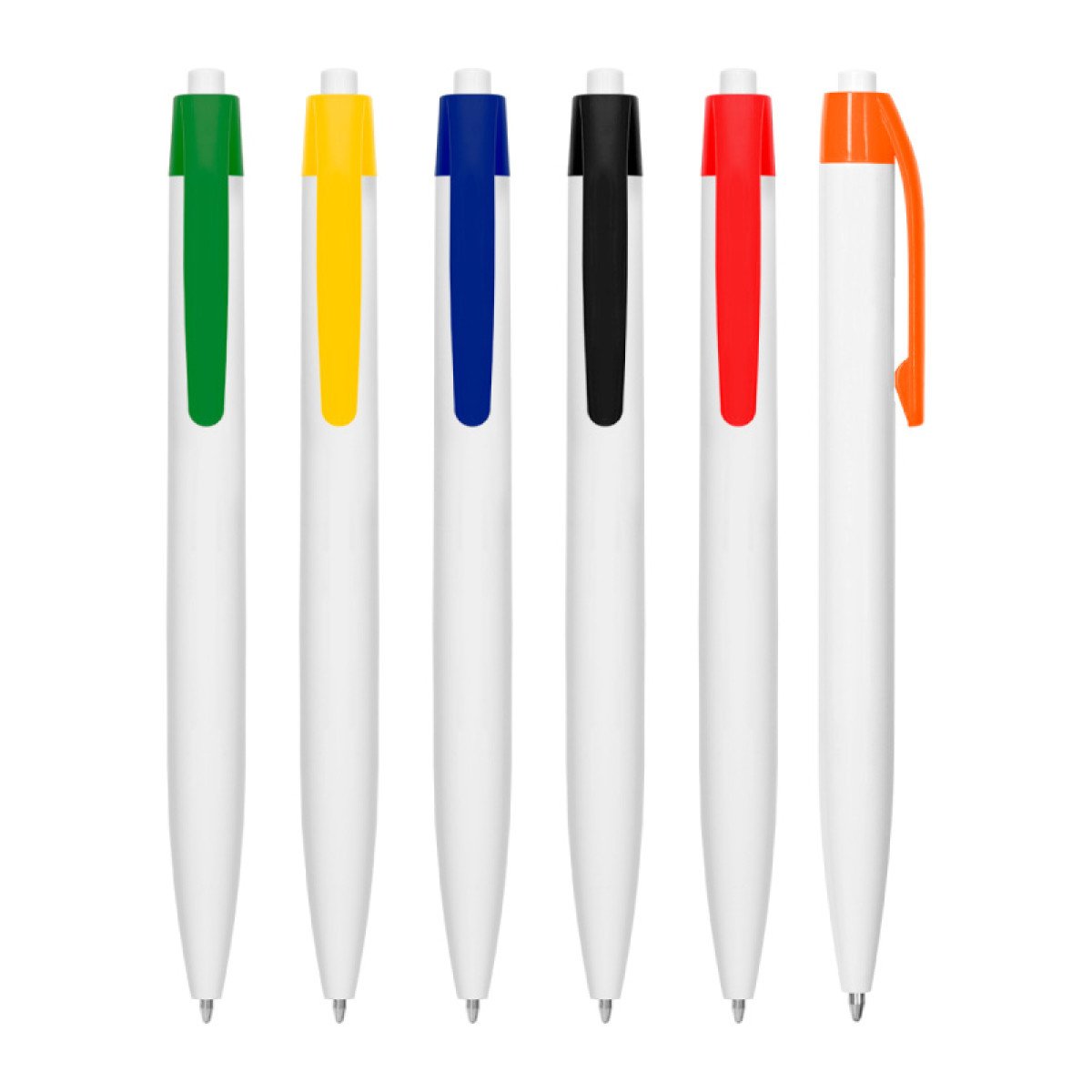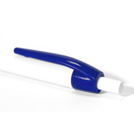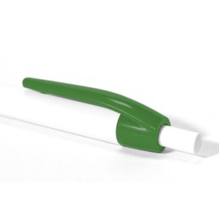 Plástico. Bolígrafo con cuerpo y pulsador de color blanco y clip en color. Tinta negra.