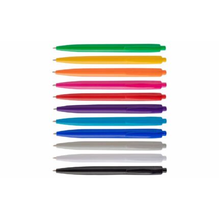 Retráctil plástico. Cuerpo y clip del mismo color. Tinta negra. Punta redonda con grosor de 1.0MM. Medidas: ø1×13,9 cm