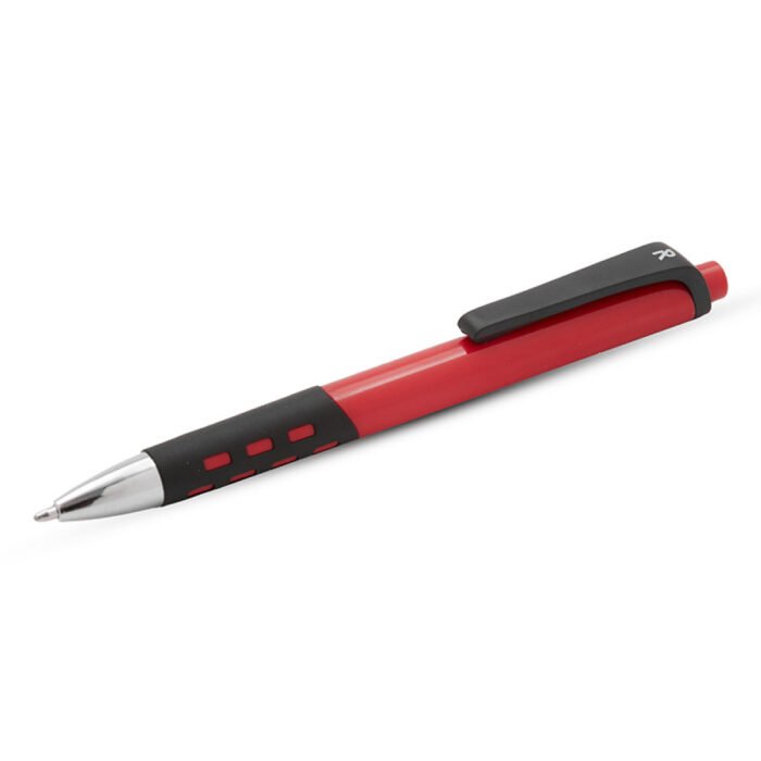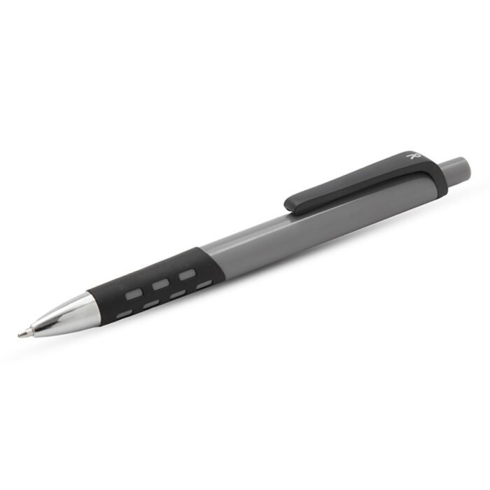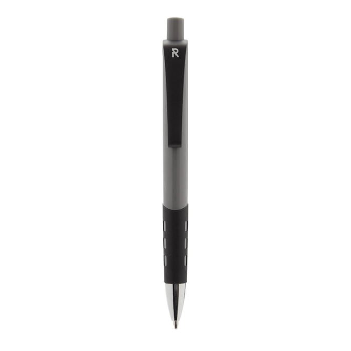 Bolígrafo de plástico, con grip de goma y clip en color negro. Sistema de apertura con pulsador. Tinta negra. Roupen.