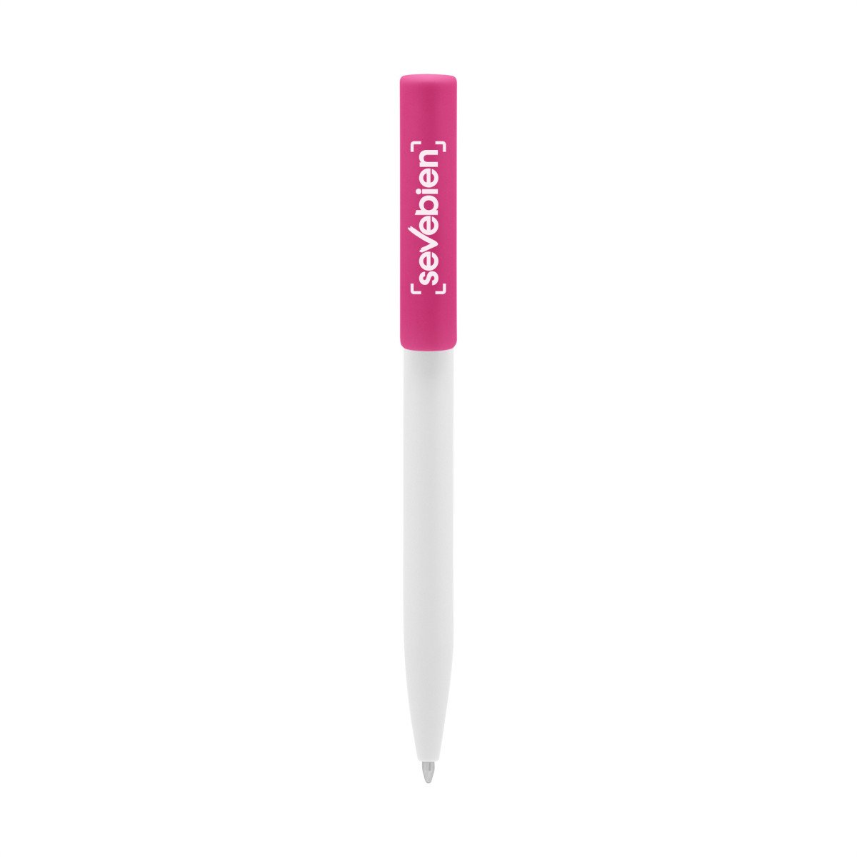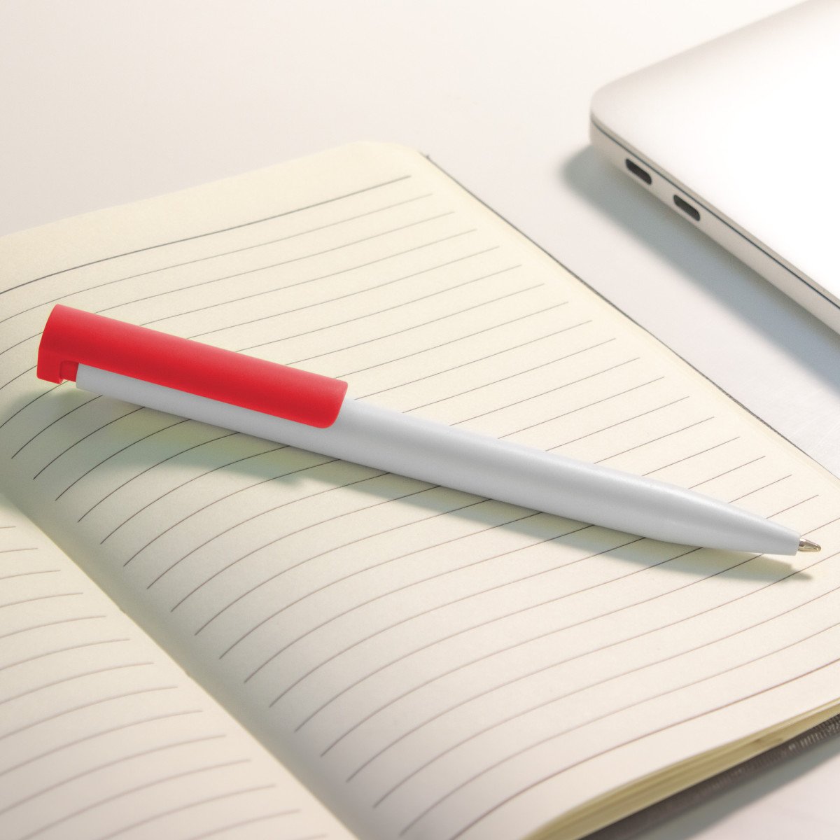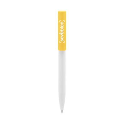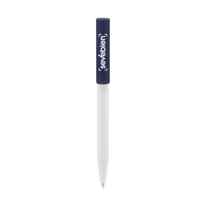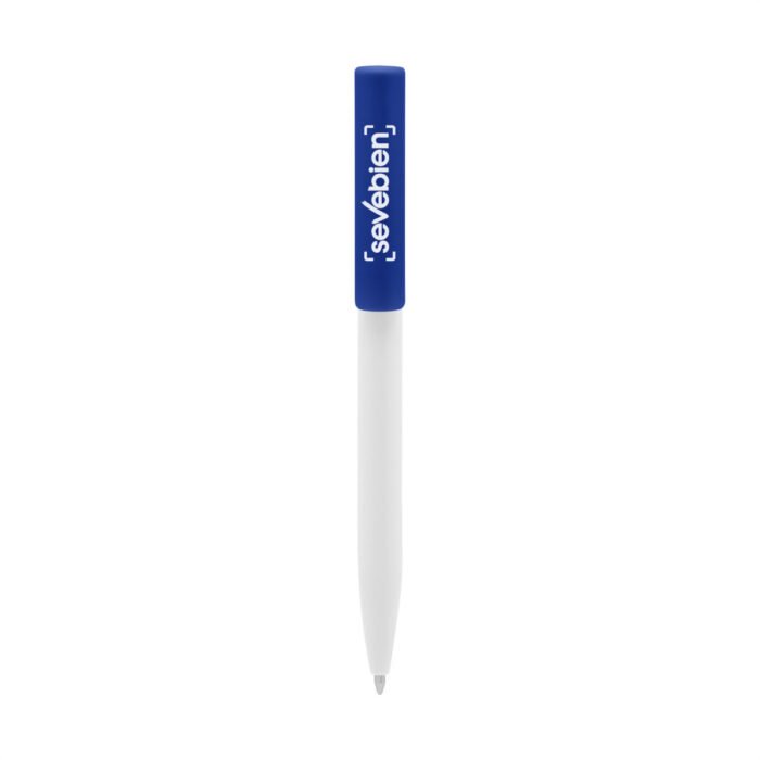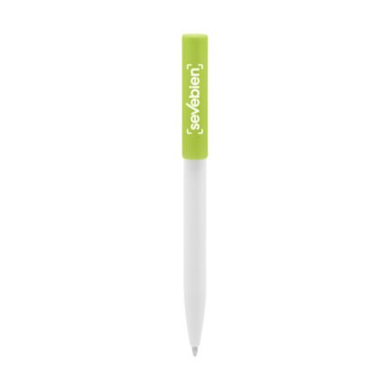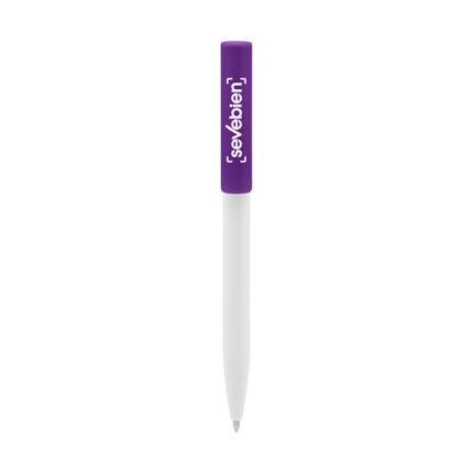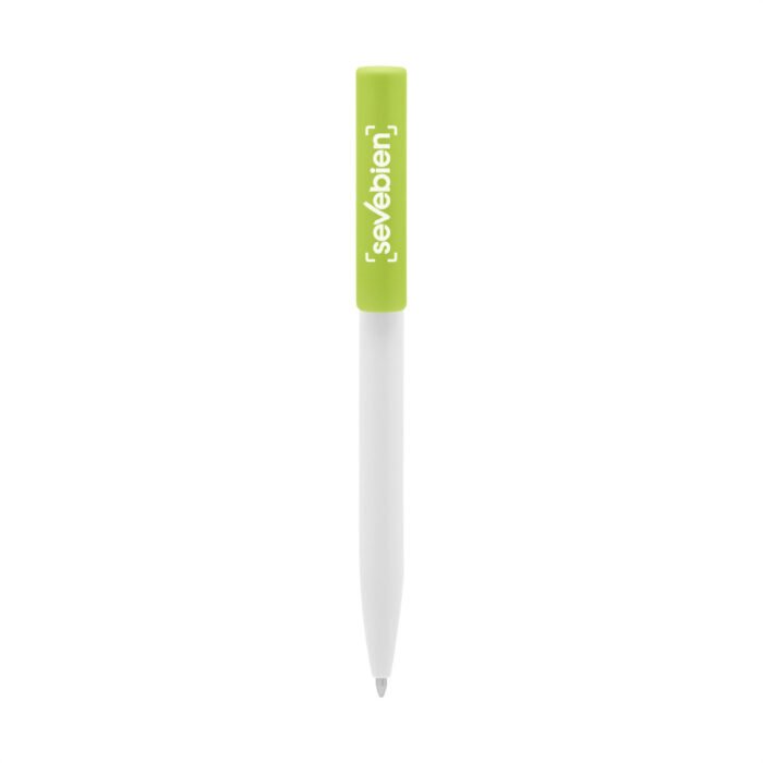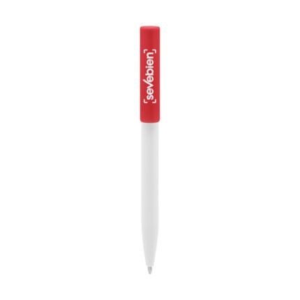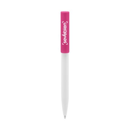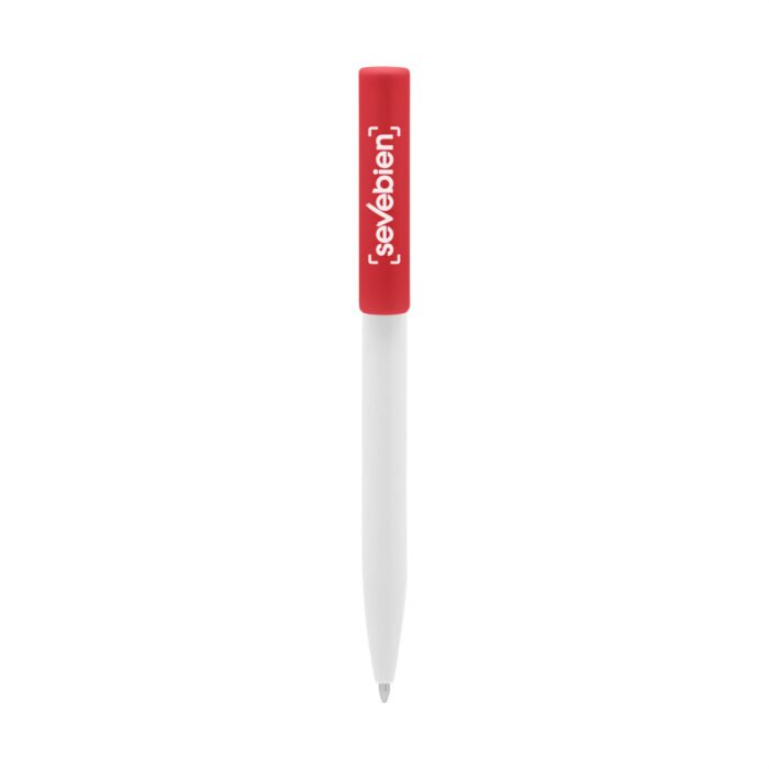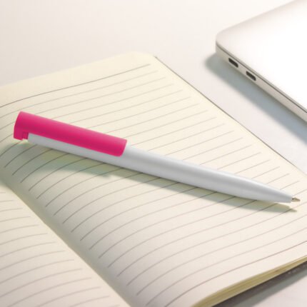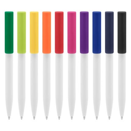 Plástico. Cuerpo blanco y clip de diferentes colores. Bolígrafo retráctil. Clip plástico de colores. Tinta negra. Sistema de botón push para destapar. Amplia área de impresión.