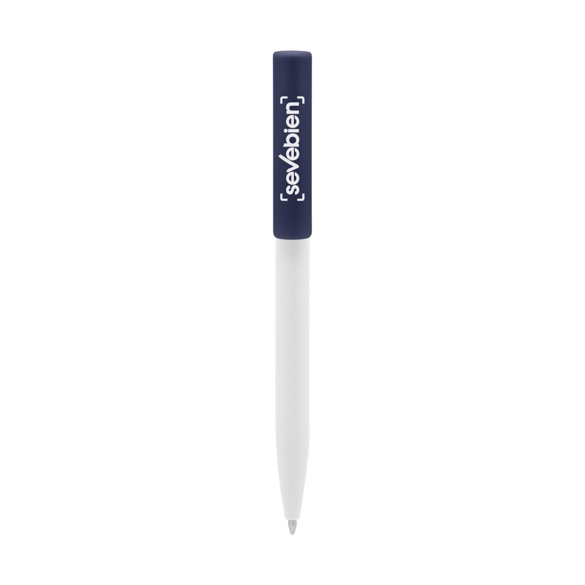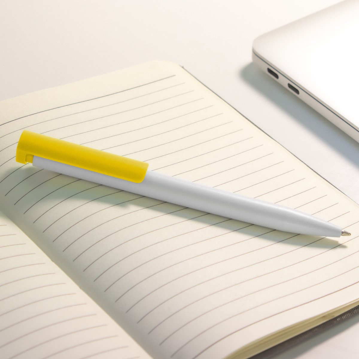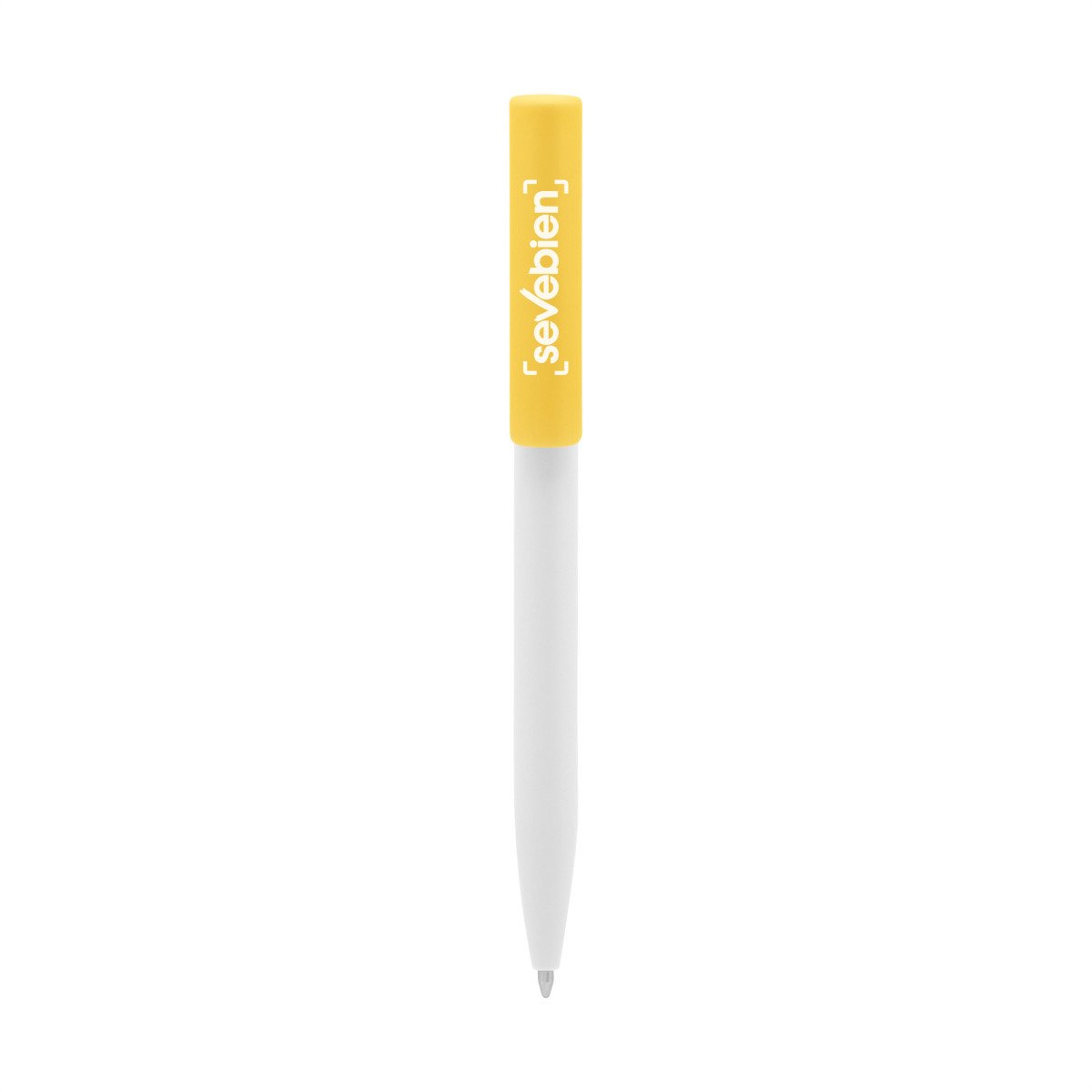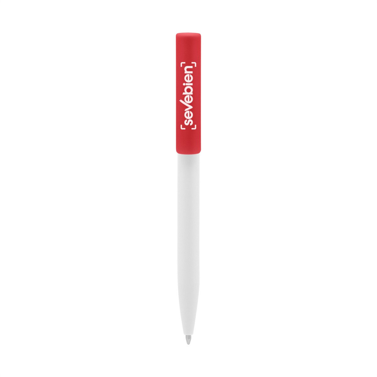 Plástico. Cuerpo blanco y clip de diferentes colores. Bolígrafo retráctil. Clip plástico de colores. Tinta negra. Sistema de botón push para destapar. Amplia área de impresión.