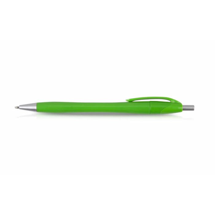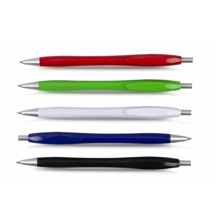 Retráctil plástico con puntera y clic plateados. Cuerpo de color. Tinta negra. Punta redonda con grosos de 1.0MM