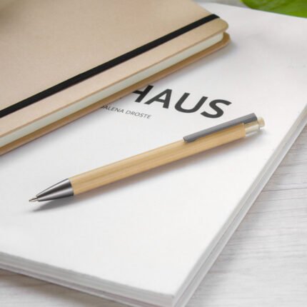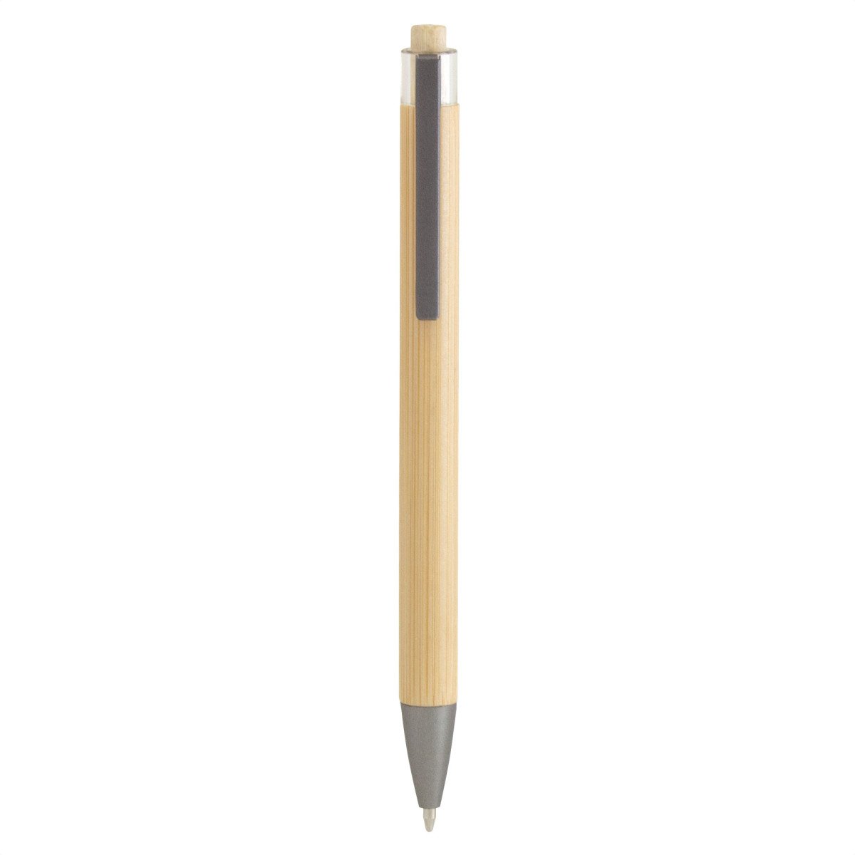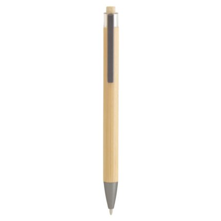 Sostenible y sofisticado.Bolígrafo retráctil. Cuerpo y botón pulsador de bambú. Clip metálico y puntera plástica en color gris gun. Medidas: 1 x 14,1 cm.