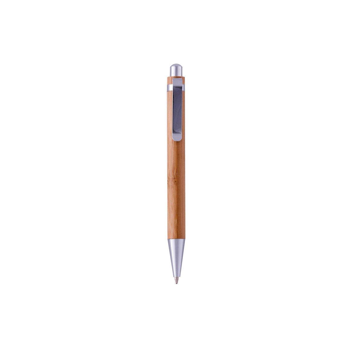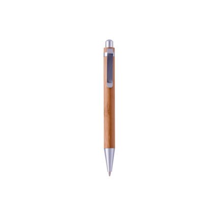 Bolígrafo cuerpo de bambú. Pulsador y puntera plásticos color plata . Clip metálico. Tinta negra.