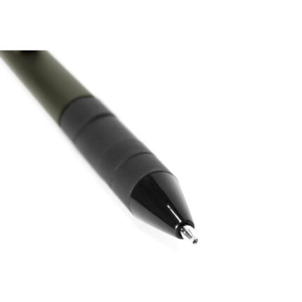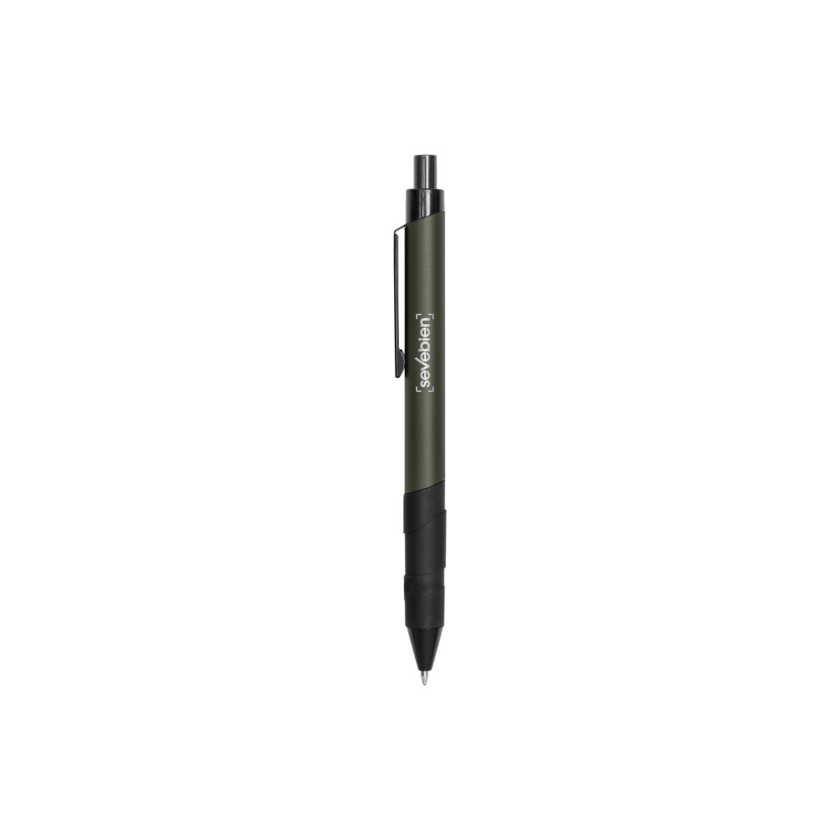 Metálico. Pulsador y puntera de plástico negro. Clip metálico en color negro. Grip de goma negro. Cuerpo de color. Tinta negra.