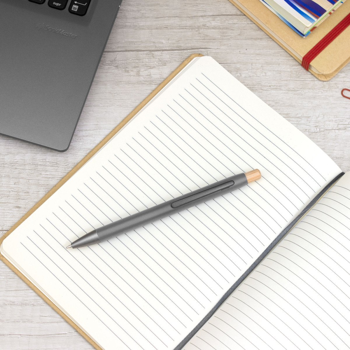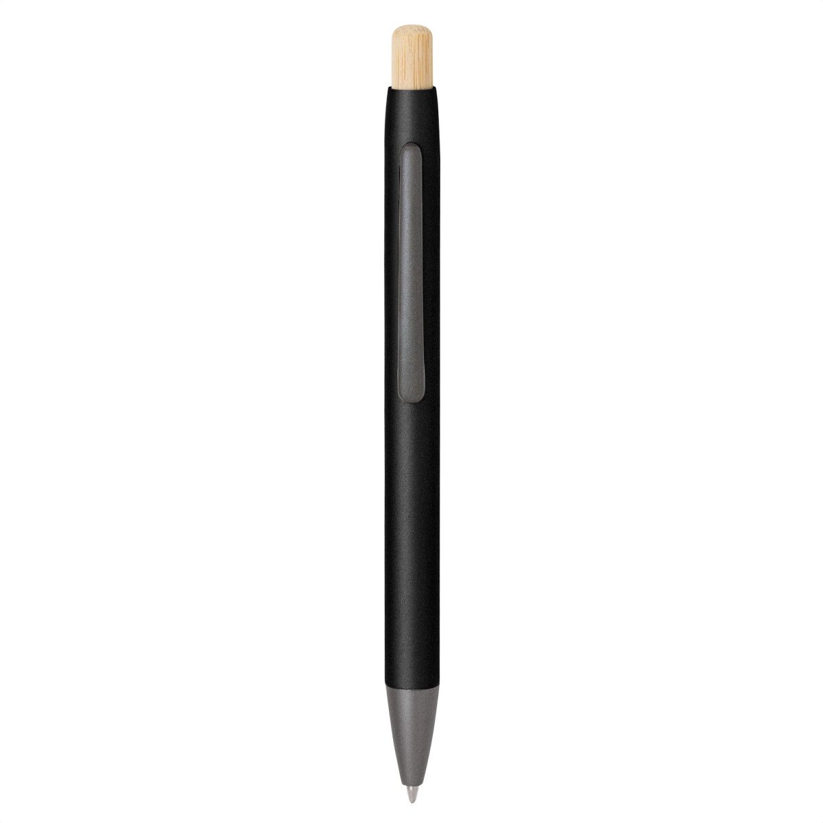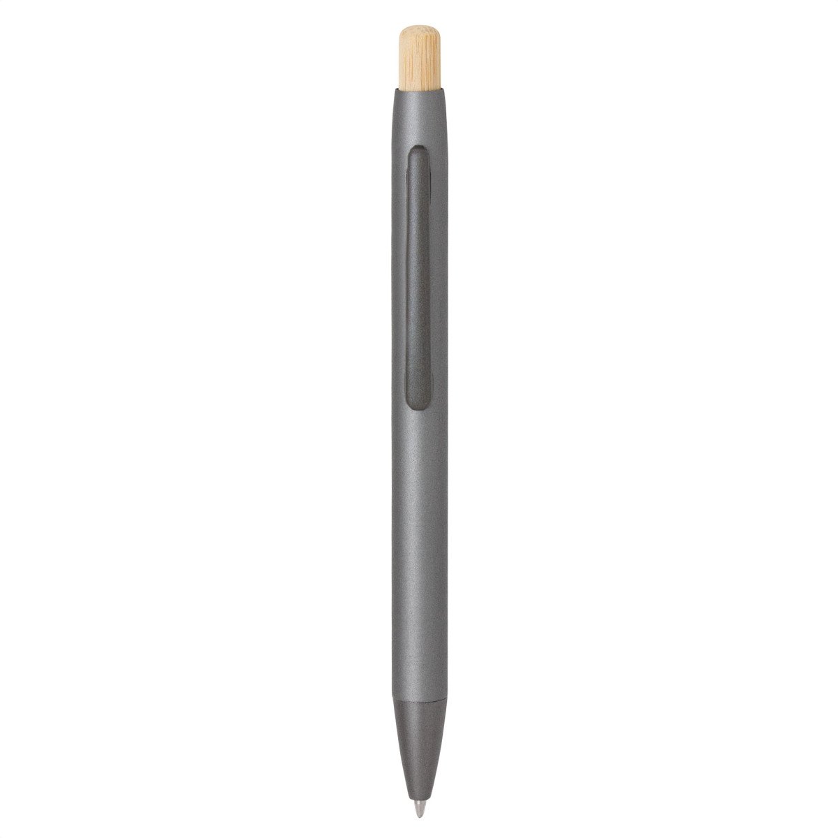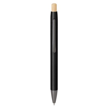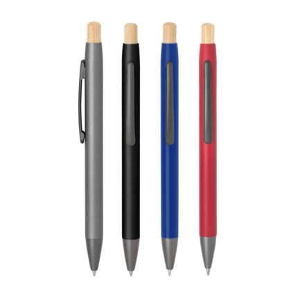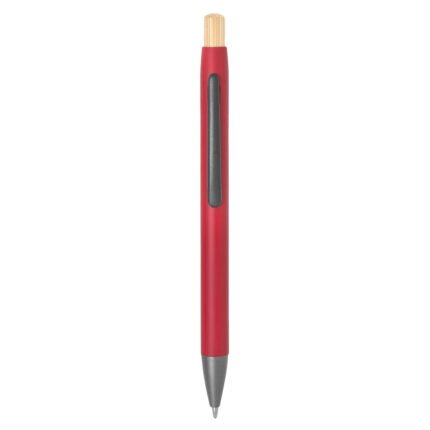 Elegancia en tus manos.Bolígrafo retráctil. Cuerpo metálico en diferentes colores acabado mate. Clip metálico, puntera plástica color gris y pulsador de bambú. Medidas: 14 cm.