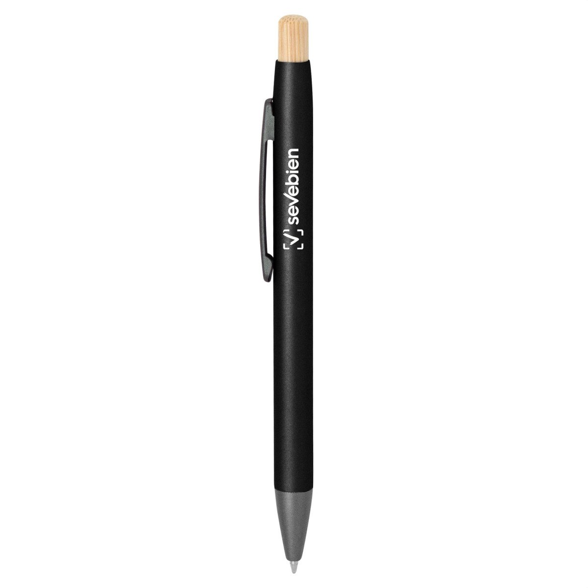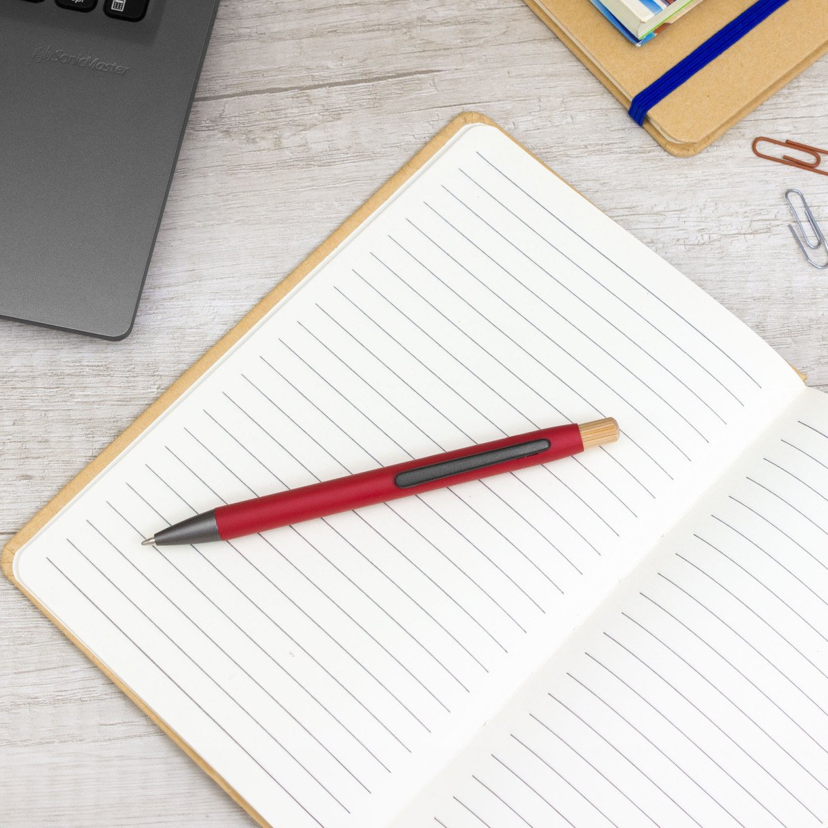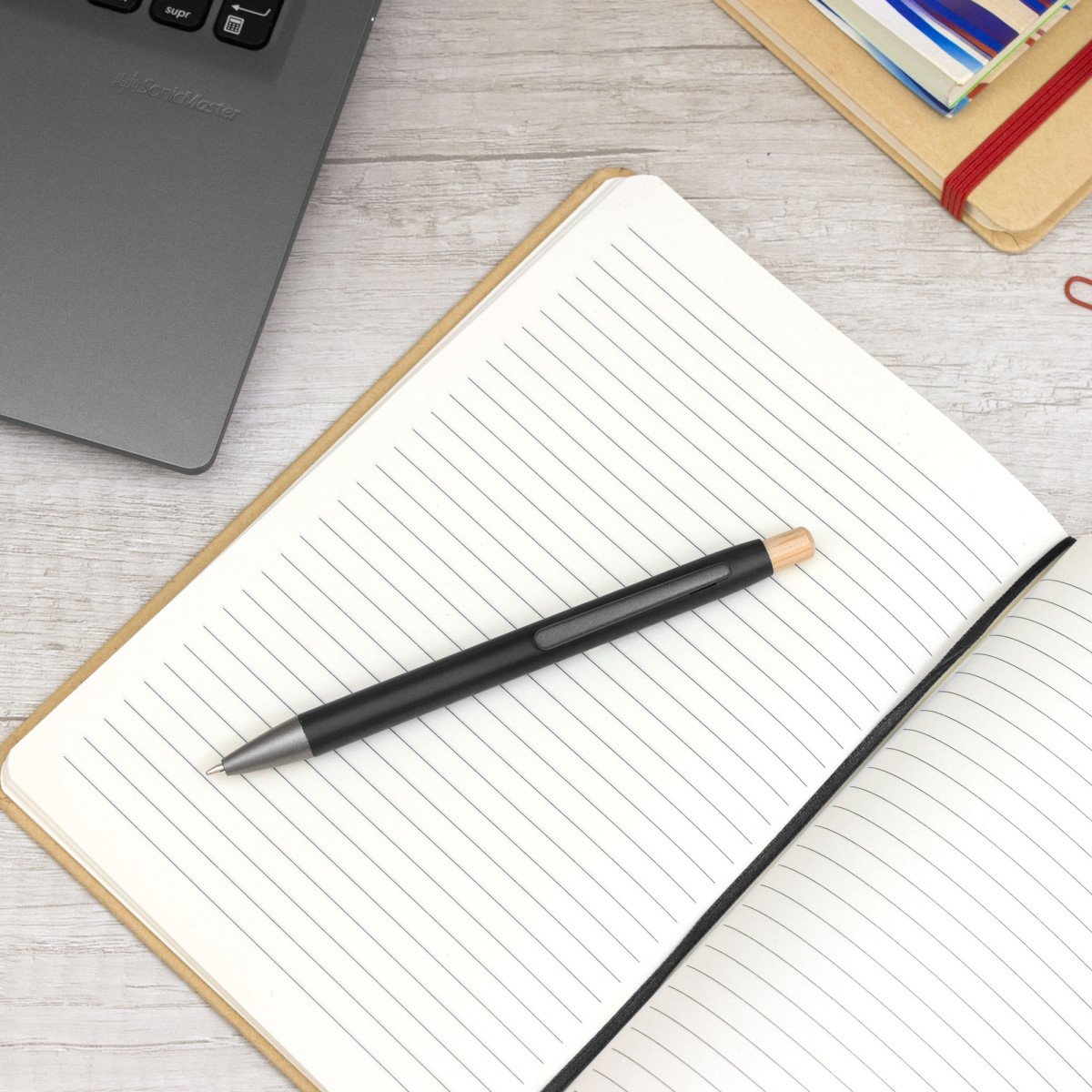 Elegancia en tus manos.Bolígrafo retráctil. Cuerpo metálico en diferentes colores acabado mate. Clip metálico, puntera plástica color gris y pulsador de bambú. Medidas: 14 cm.