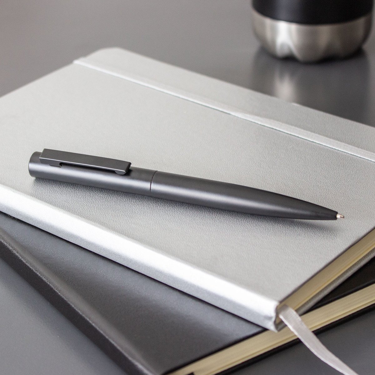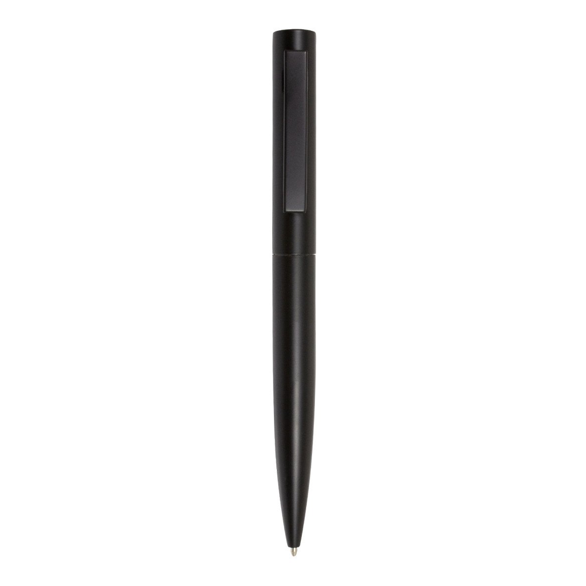 Metal. Cuerpo metálico negro mate. Clip del mismo color. Apertura giratoria. Tinta negra.