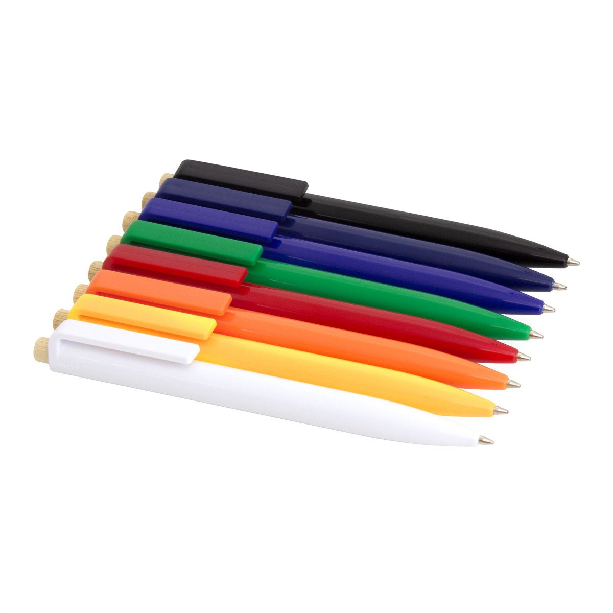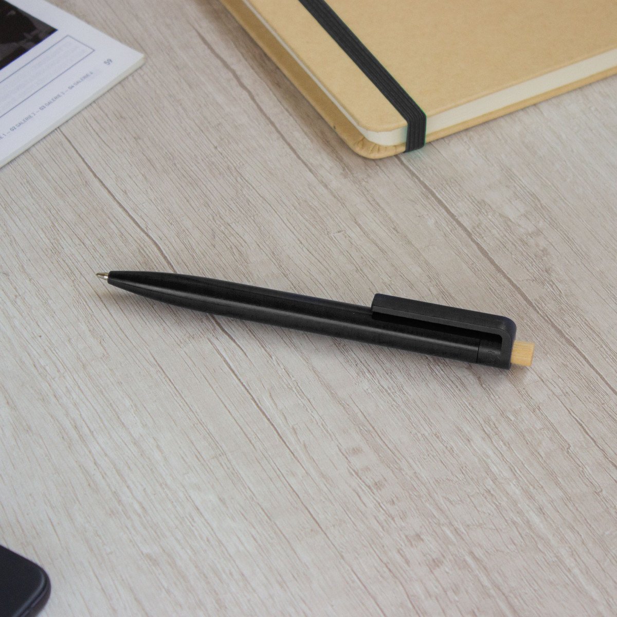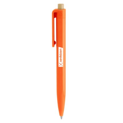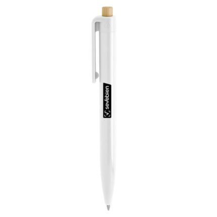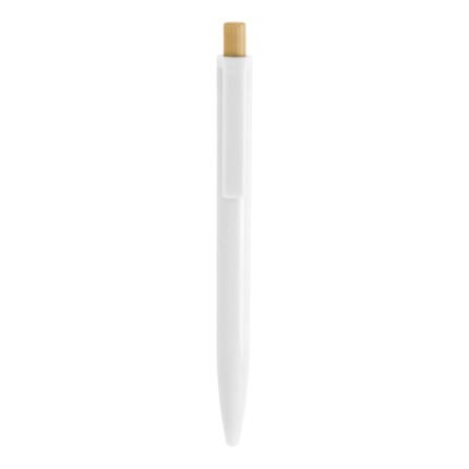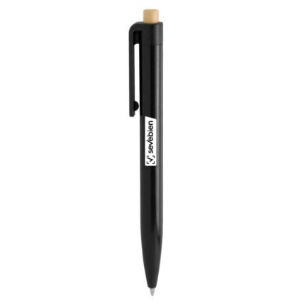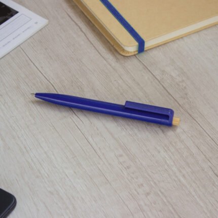 Diseño moderno con materiales reciclados.Bolígrafo retráctil. Cuerpo plástico en diferentes colores acabado brillante. Pulsador de bambú. Medidas: 1,05 x 13,5 cm.