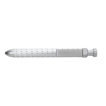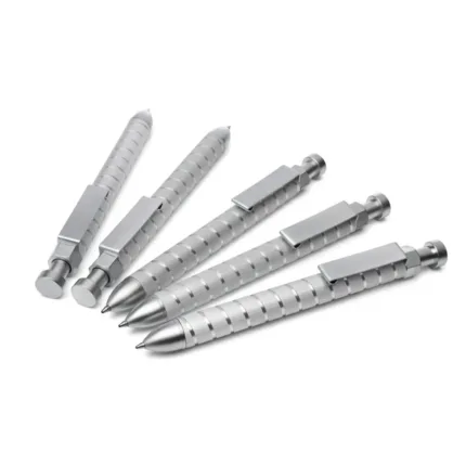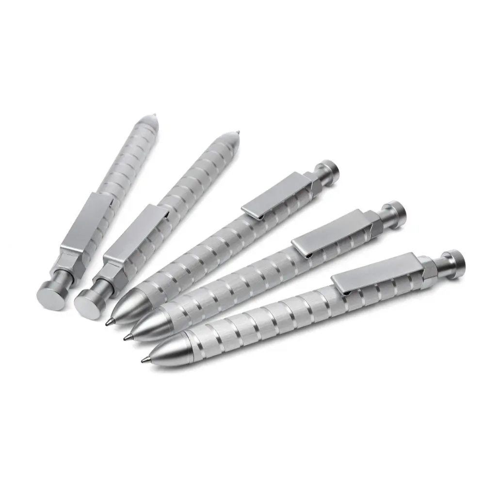 Bolígrafo ondulado. Acero. Tinta Negra. Mecanismo de apertura retráctil.