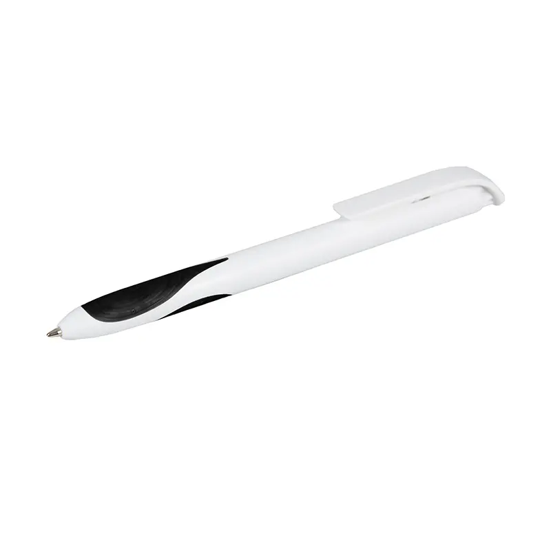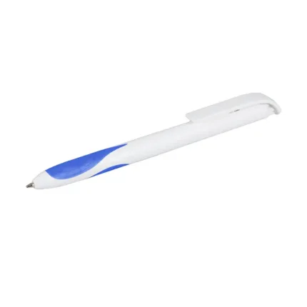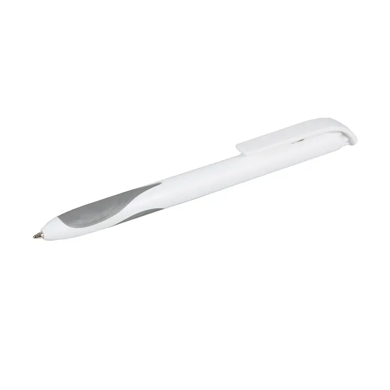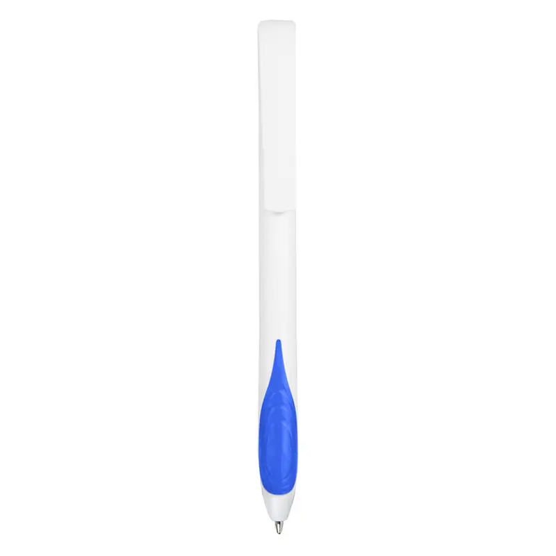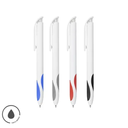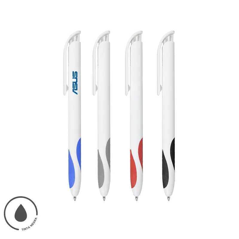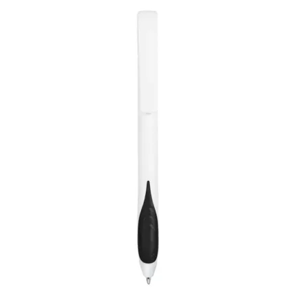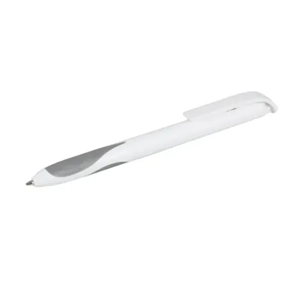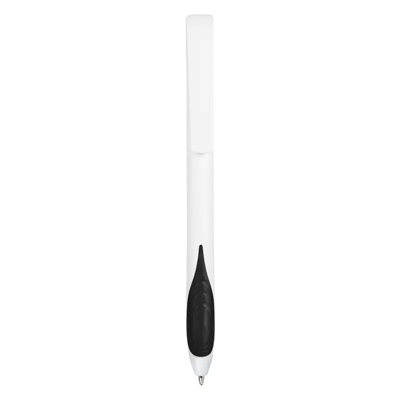 Bolígrafo plástico de cuerpo y clip en color blanco. Grip en TPR de color. Apertura con pulsador. Tinta Negra 500 m de longitud de escritura.