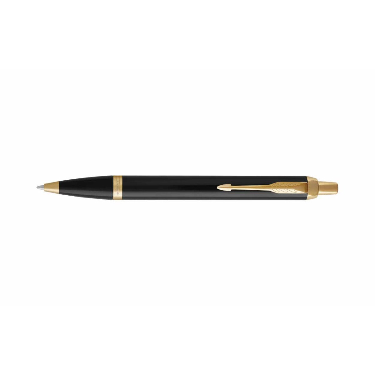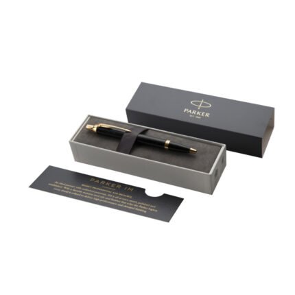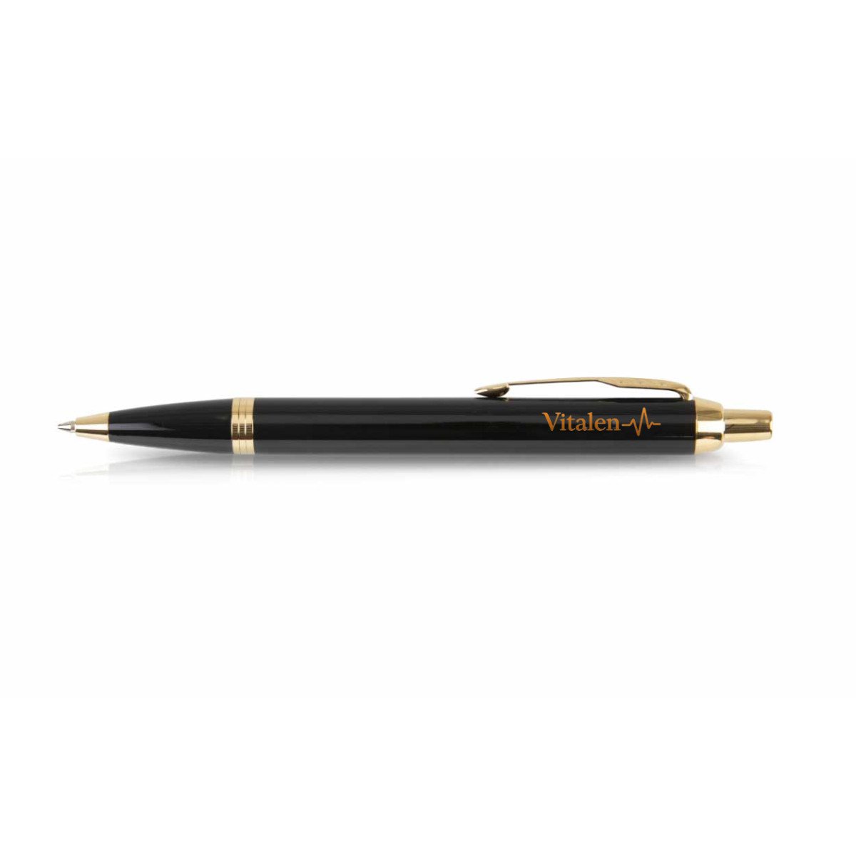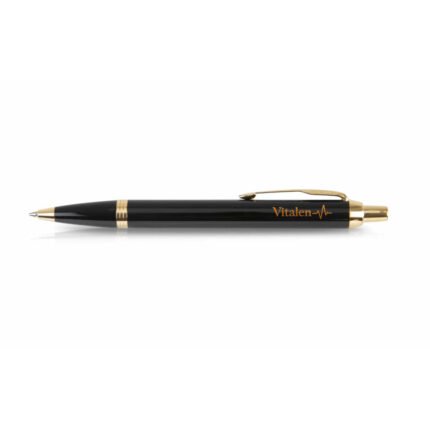 Bolígrafo de laca negra, cromado y punta media. Este modelo es sofisticado y de un notable diseño. Tinta Azul. Acabado de impresión láser en tono cobrizo/dorado.