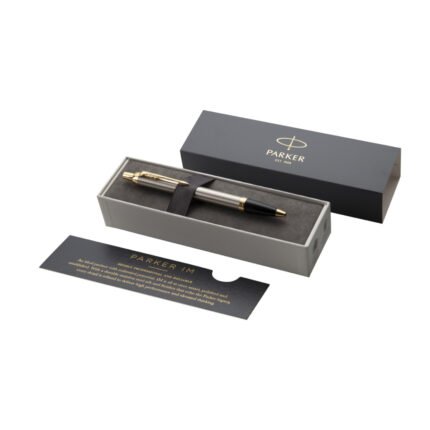 Bolígrafo de laca negra, cromado y punta media. Este modelo es sofisticado y de un notable diseño Acabado de impresión láser en tono cobrizo/dorado.