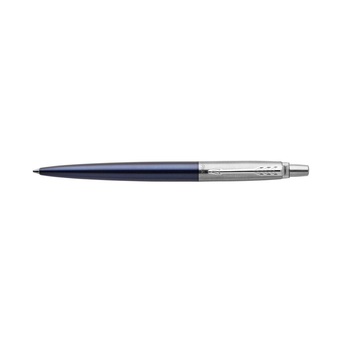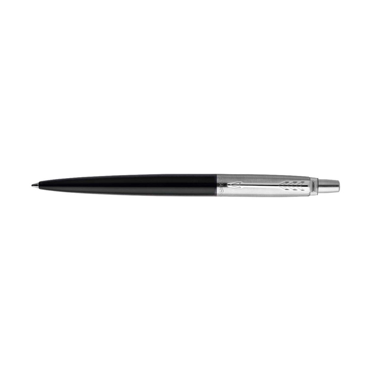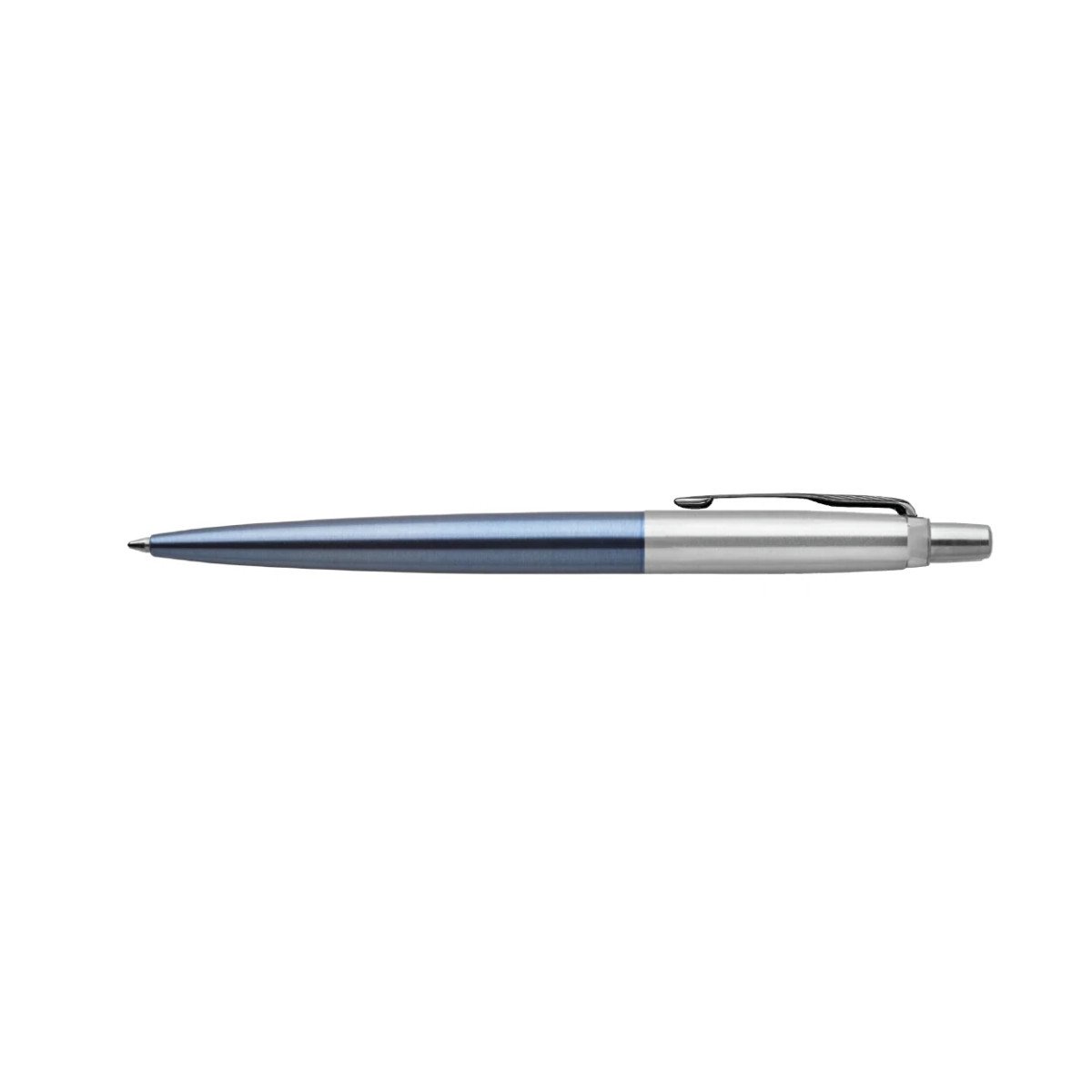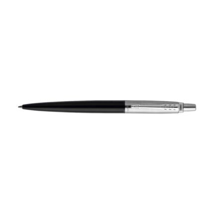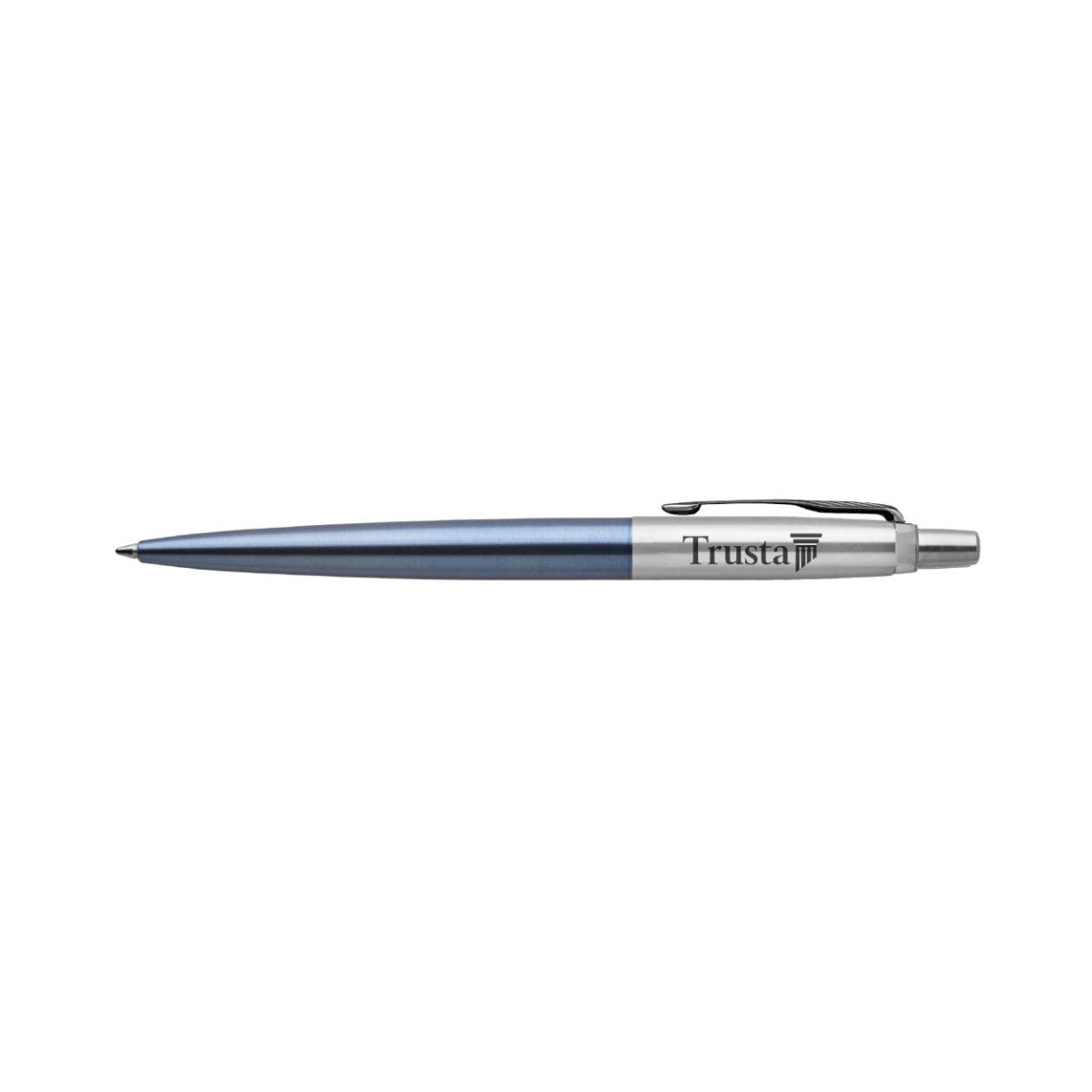 Bolígrafo de acero inoxidable cromado con punta media. Tinta azul. Acabado de impresión láser en tono gris oscuro/negro.