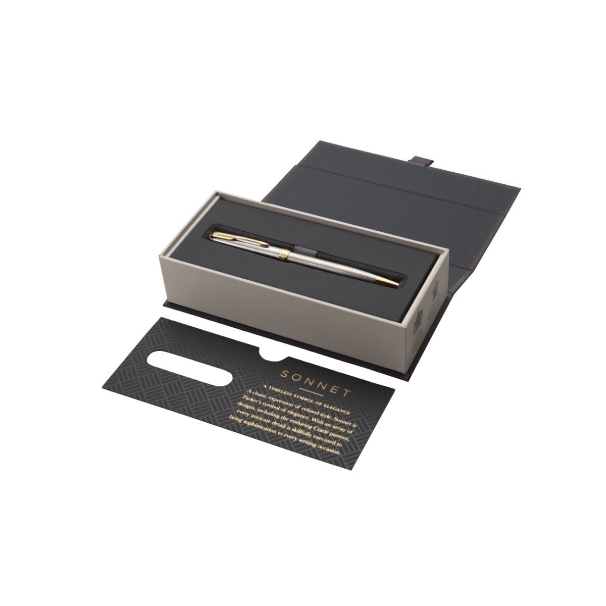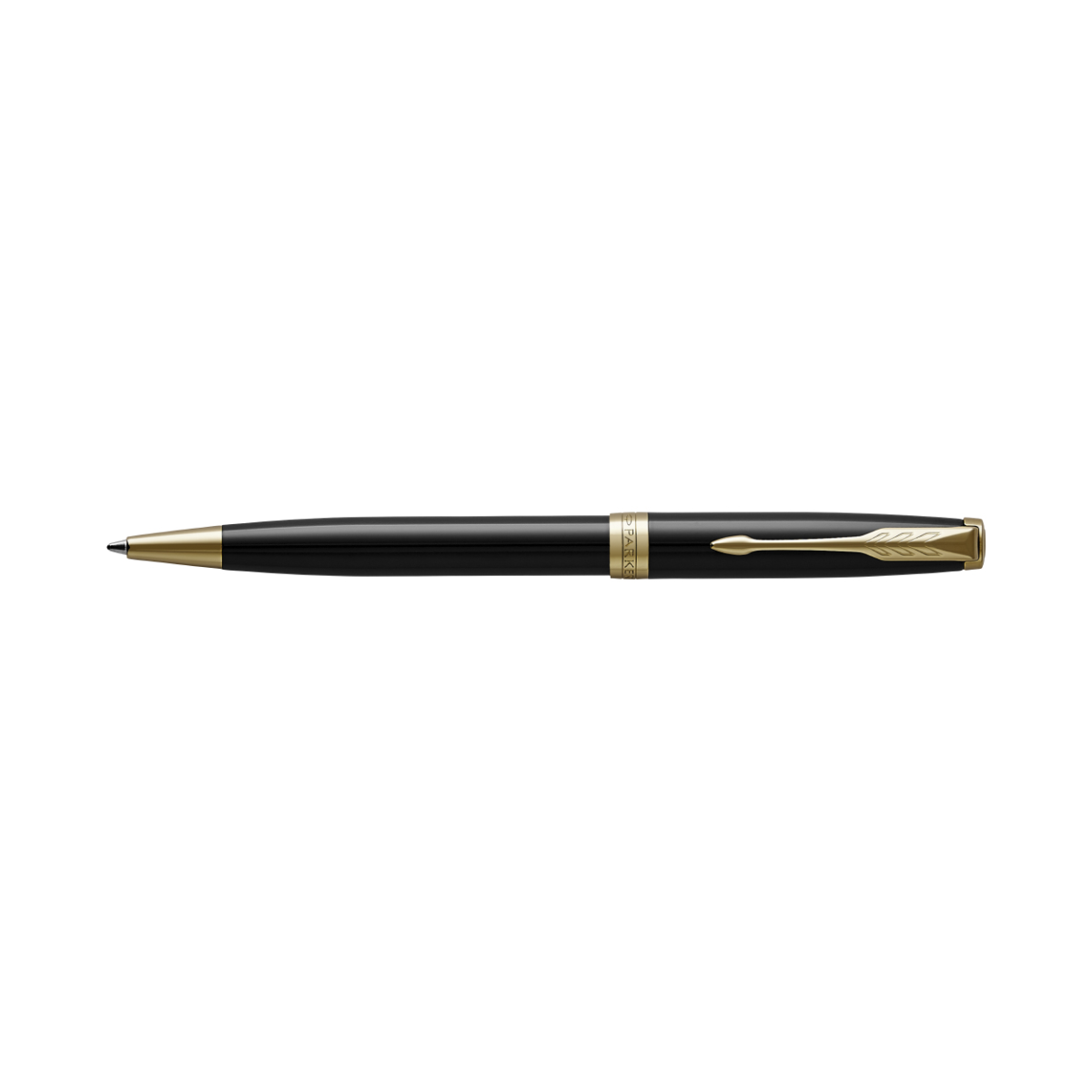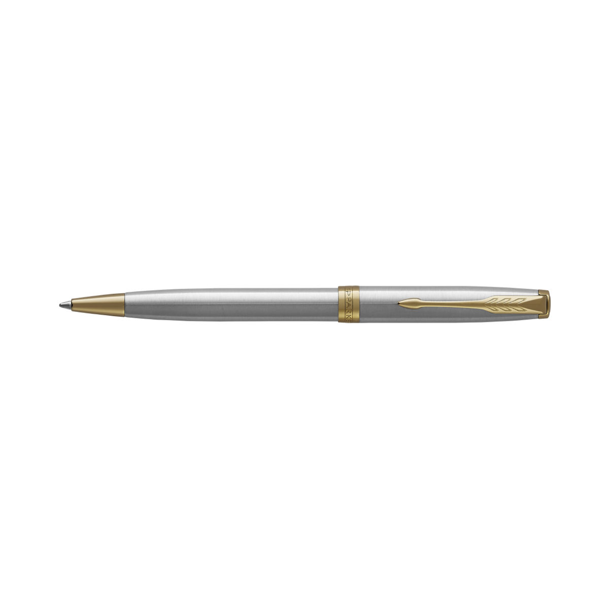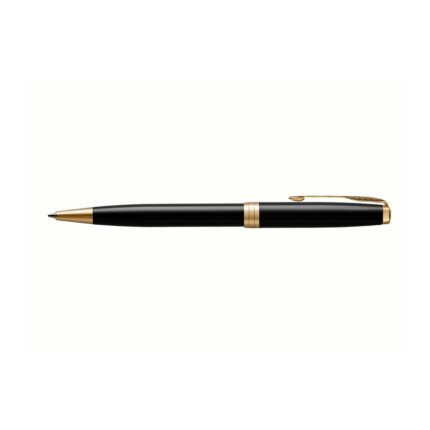Bolígrafo de acero inoxidable dorado con punta media. Este modelo es el símbolo de la elegancia y una muestra clásica de estilo refinado de la marca. Incluye estuche. Tinta Negra. Acabado de impresión láser en tono gris oscuro/negro.