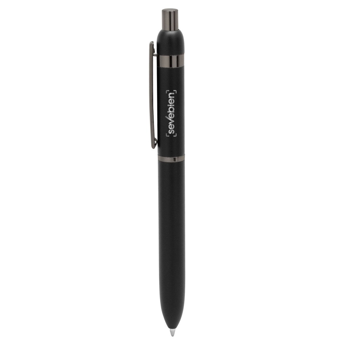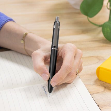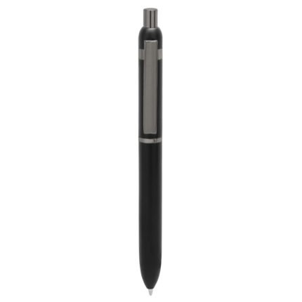Metal. Cuerpo de aluminio. Bolígrafo retráctil. Clip, botón y anillos metálicos color plata oscuro. Tinta Negra. Destape electroplateado en ambas partes. Presentación en estuche con cierre magnético.