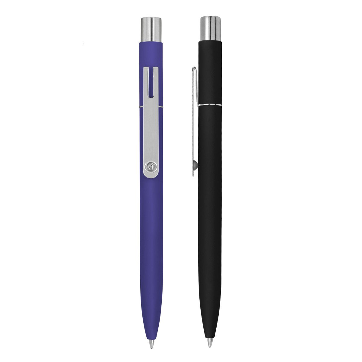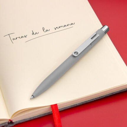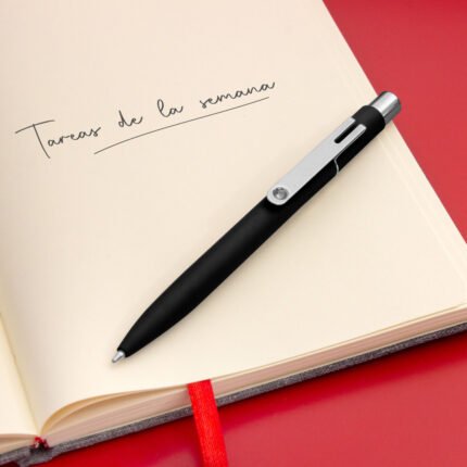 Metal. Cuerpo de aluminio, acabado engomado en diferentes colores, muy suave al tacto. Bolígrafo retráctil. Clip, pulsador y anillo metálicos color plata. Tinta negra. Destape al grabar color plata.