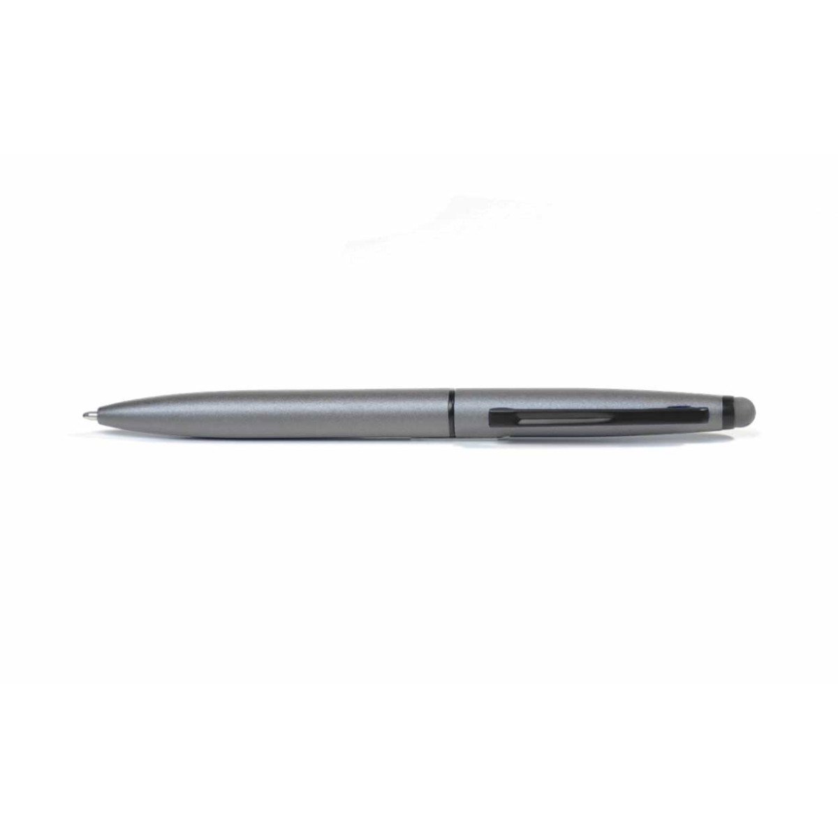 Bolígrafo cuerpo de aluminio con acabado mate, base color plateada para impresión láser. Clip metálico en negro y con touch del color del cuerpo. Medio giro. Tinta negra. Trazo: 1.0 mm