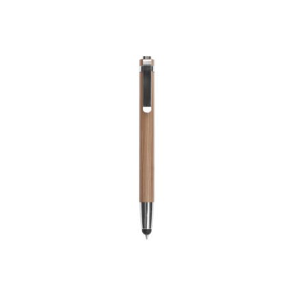 Bambú. Cuerpo de bambú con clip metálico. Pulsador y puntera de plástico color plata. Tinta negra. Punta táctil touch para pantallas táctiles.