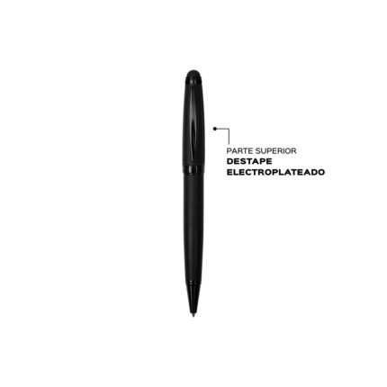 Metal. Cuerpo metálico negro mate. Clip y puntera de metal. En la parte de arriba touch. Apertura giratoria. Tinta negra. Con estuche. Destape electroplateado en la parte superior. Presentación en caja de regalo.