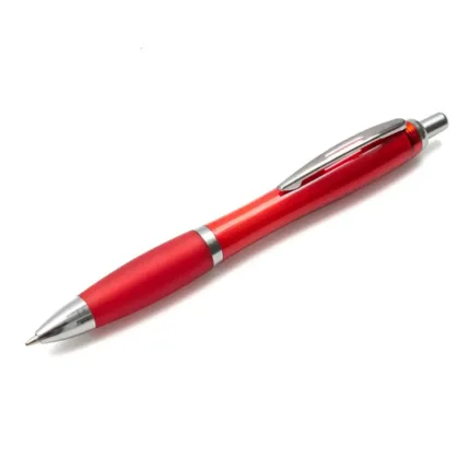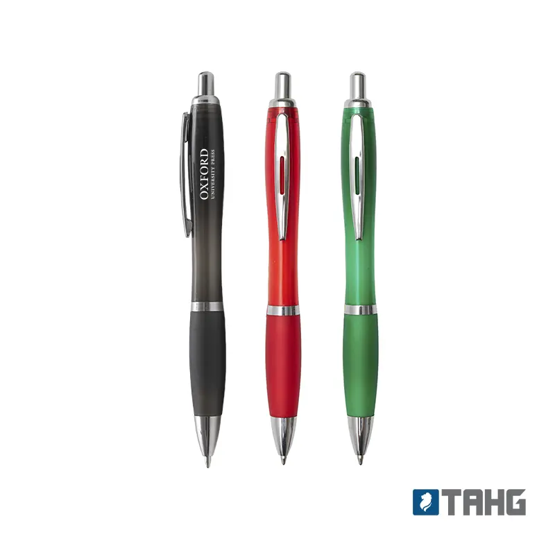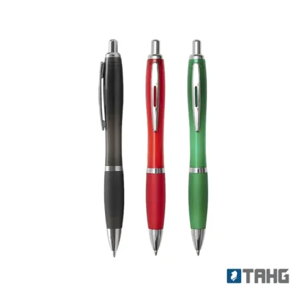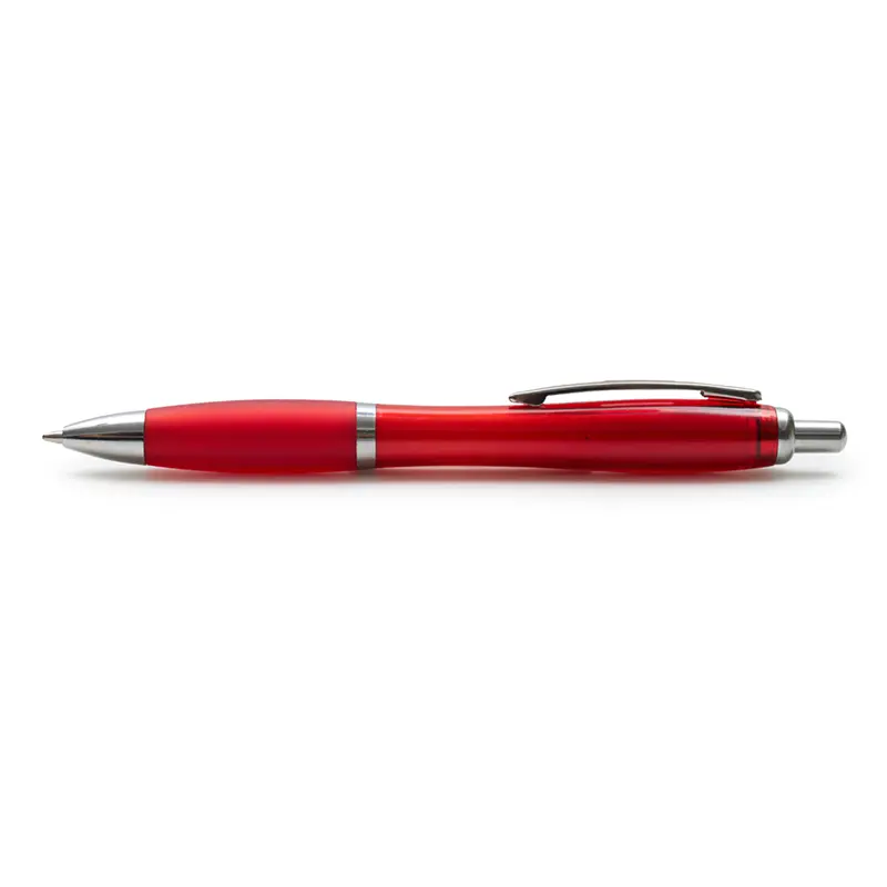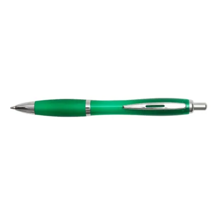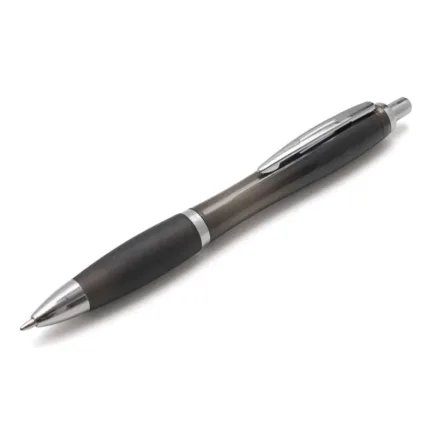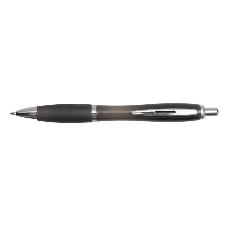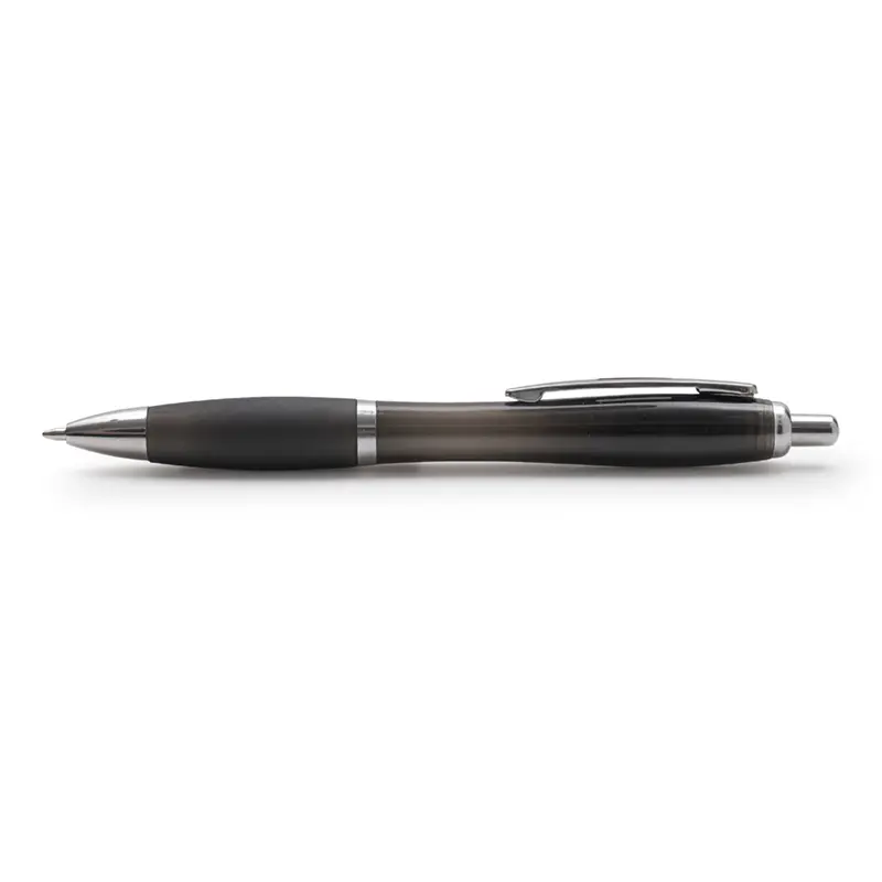 Bolígrafo con cuerpo curvo plástico en acabado degradado. Cuenta con grip de goma de color, clip y botón metálico, mecanismo retráctil y tinta negra.