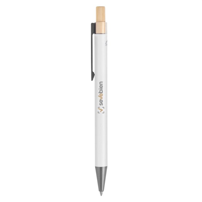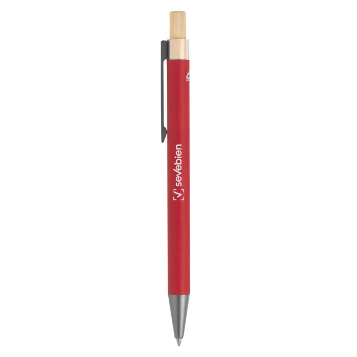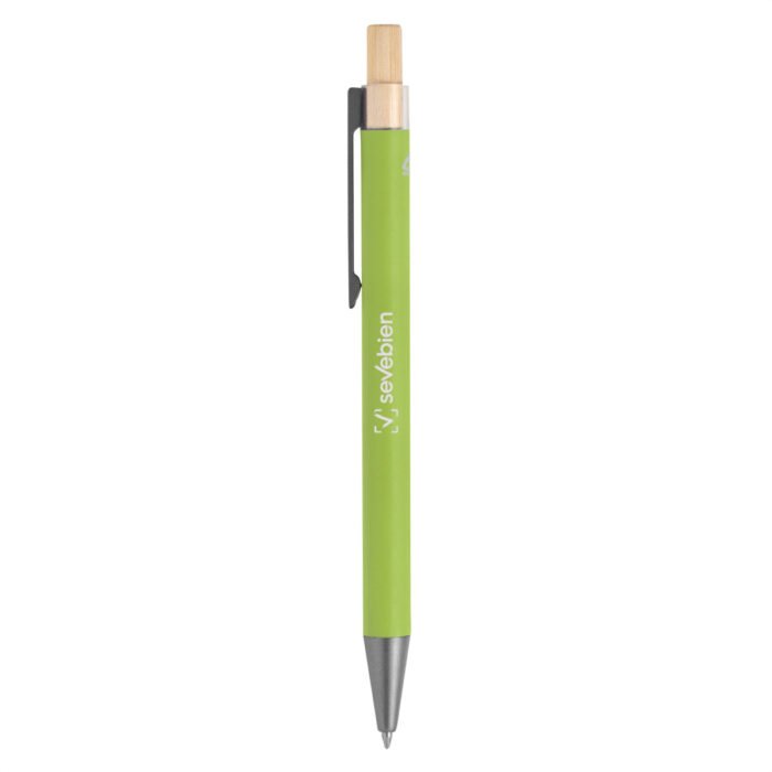 Elegancia y sostenibilidad. Bolígrafo retráctil. Cuerpo metálico en diferentes colores acabado mate. Clip metálico y puntera plástica color gris acabado mate. Pulsador de bambú.Medidas: 14 cm.
