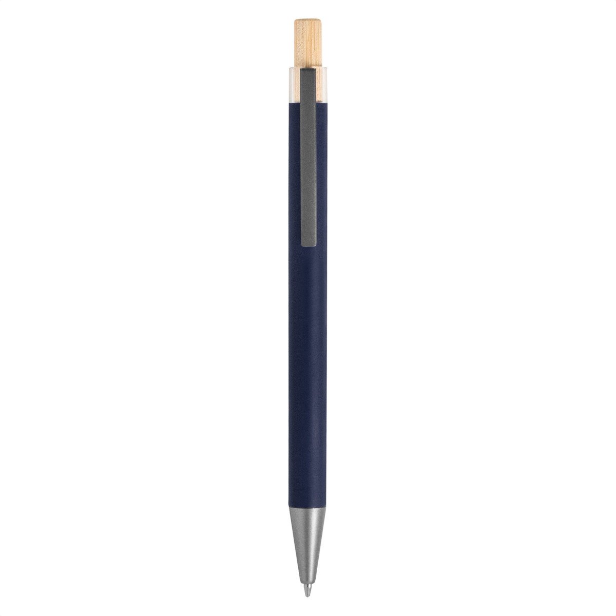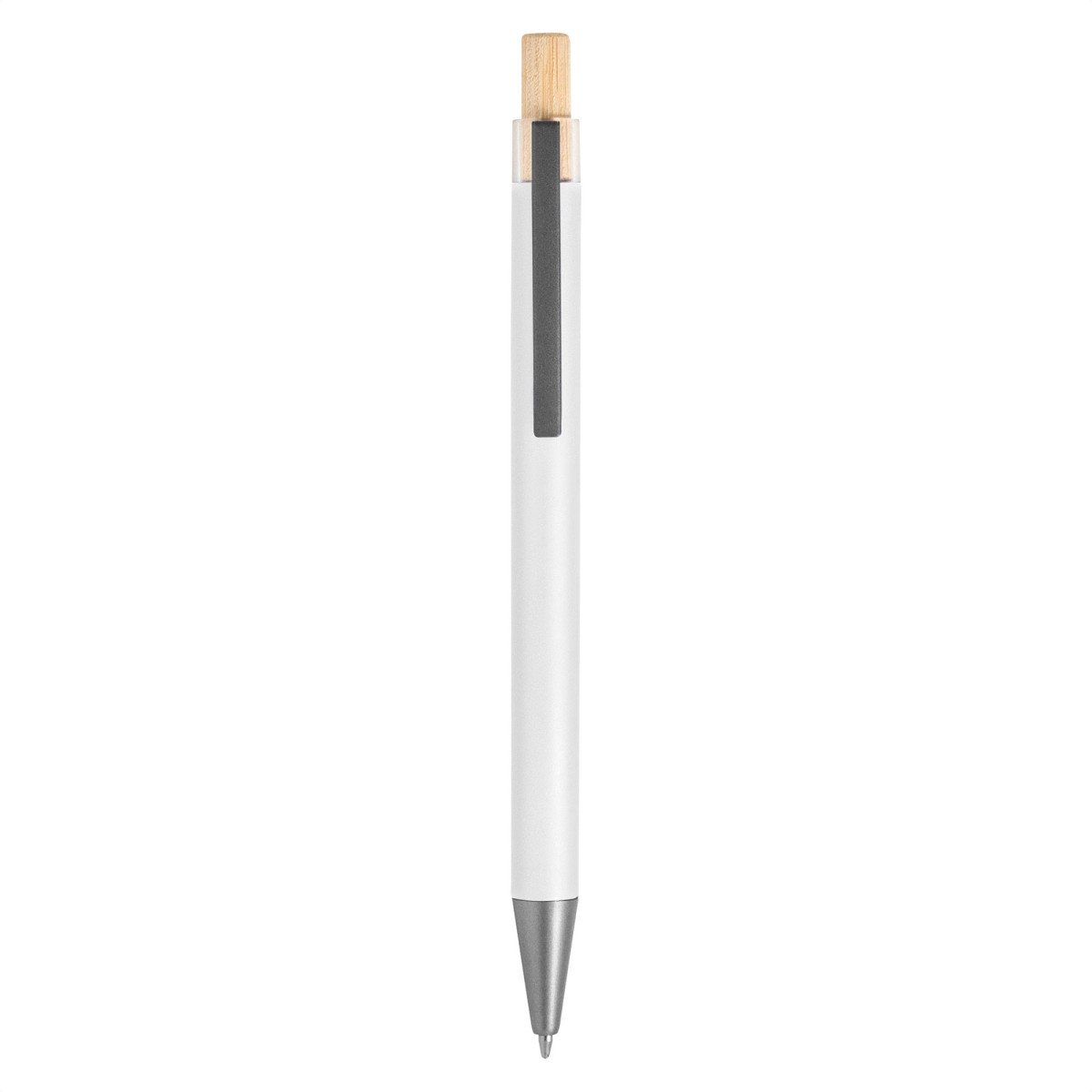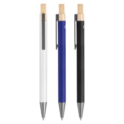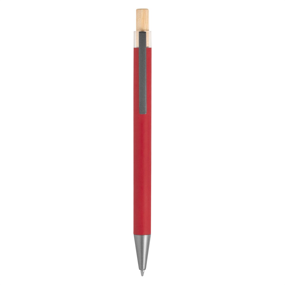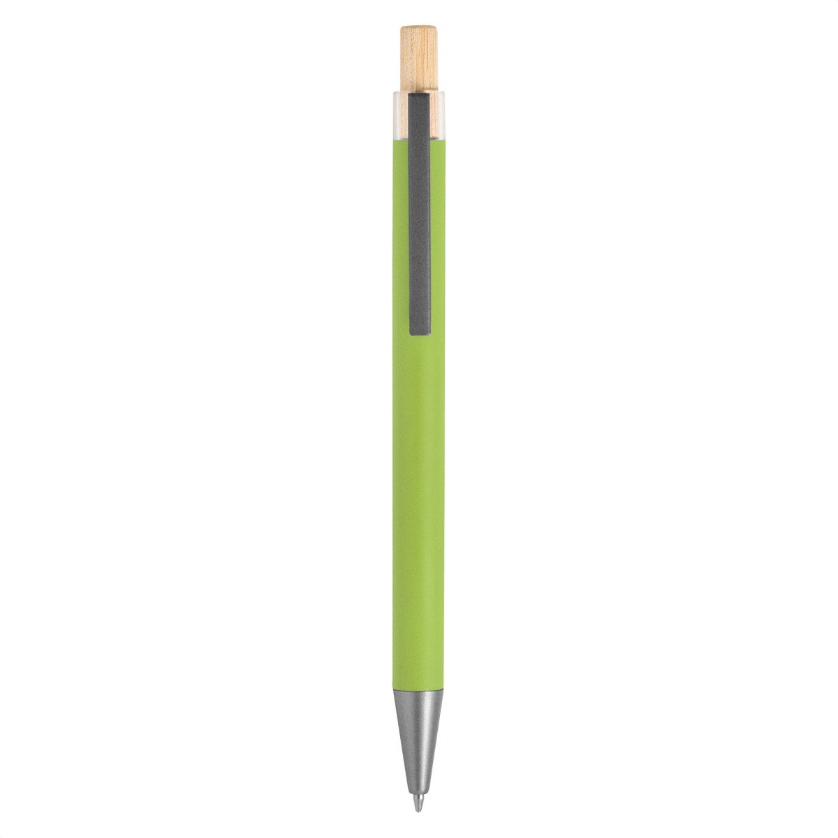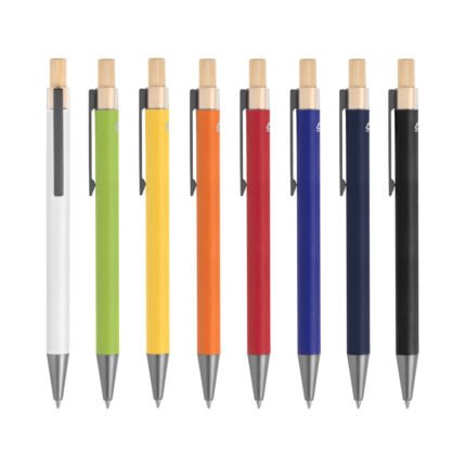 Elegancia y sostenibilidad. Bolígrafo retráctil. Cuerpo metálico en diferentes colores acabado mate. Clip metálico y puntera plástica color gris acabado mate. Pulsador de bambú.Medidas: 14 cm.
