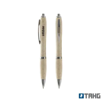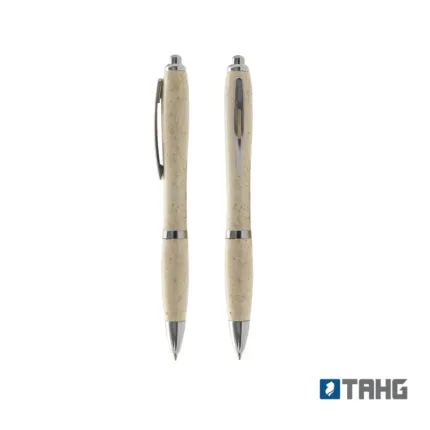 Bolígrafo de materiales sustentables de color beige. Hecho a base de WheatStraw, pasta de tallo de trigo, un material sustentable que reduce el consumo de plásticos vírgenes. Ideal para tener a mano y estar siempre preparado para anotar, escribir, firmar, etc.