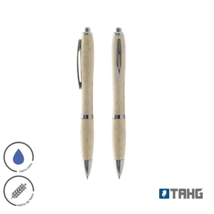 Bolígrafo de materiales sustentables de color beige. Hecho a base de WheatStraw, pasta de tallo de trigo, un material sustentable que reduce el consumo de plásticos vírgenes. Ideal para tener a mano y estar siempre preparado para anotar, escribir, firmar, etc.