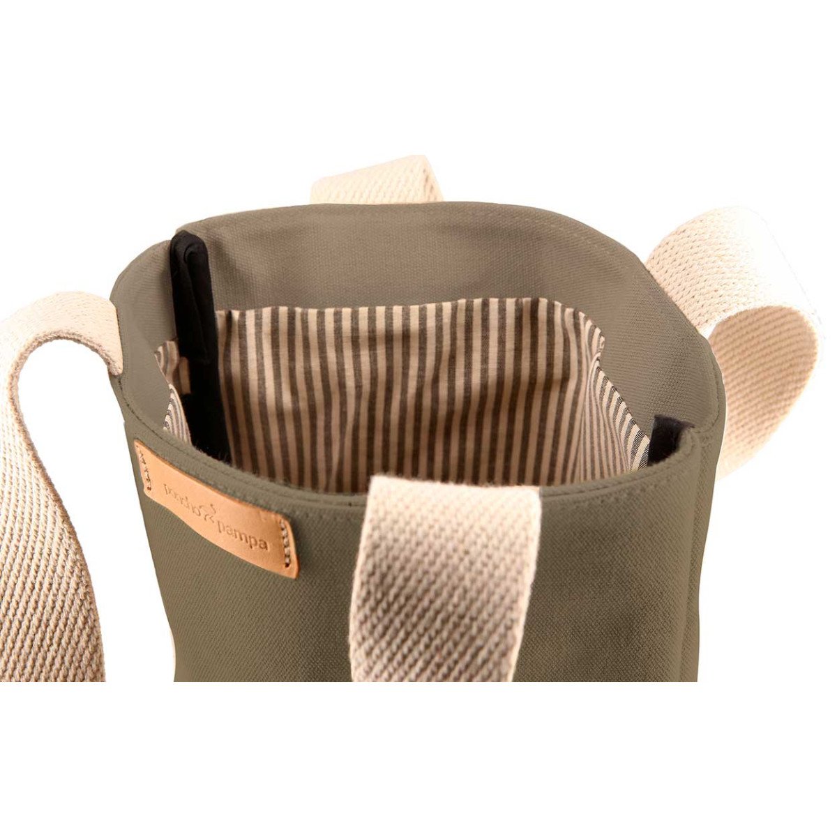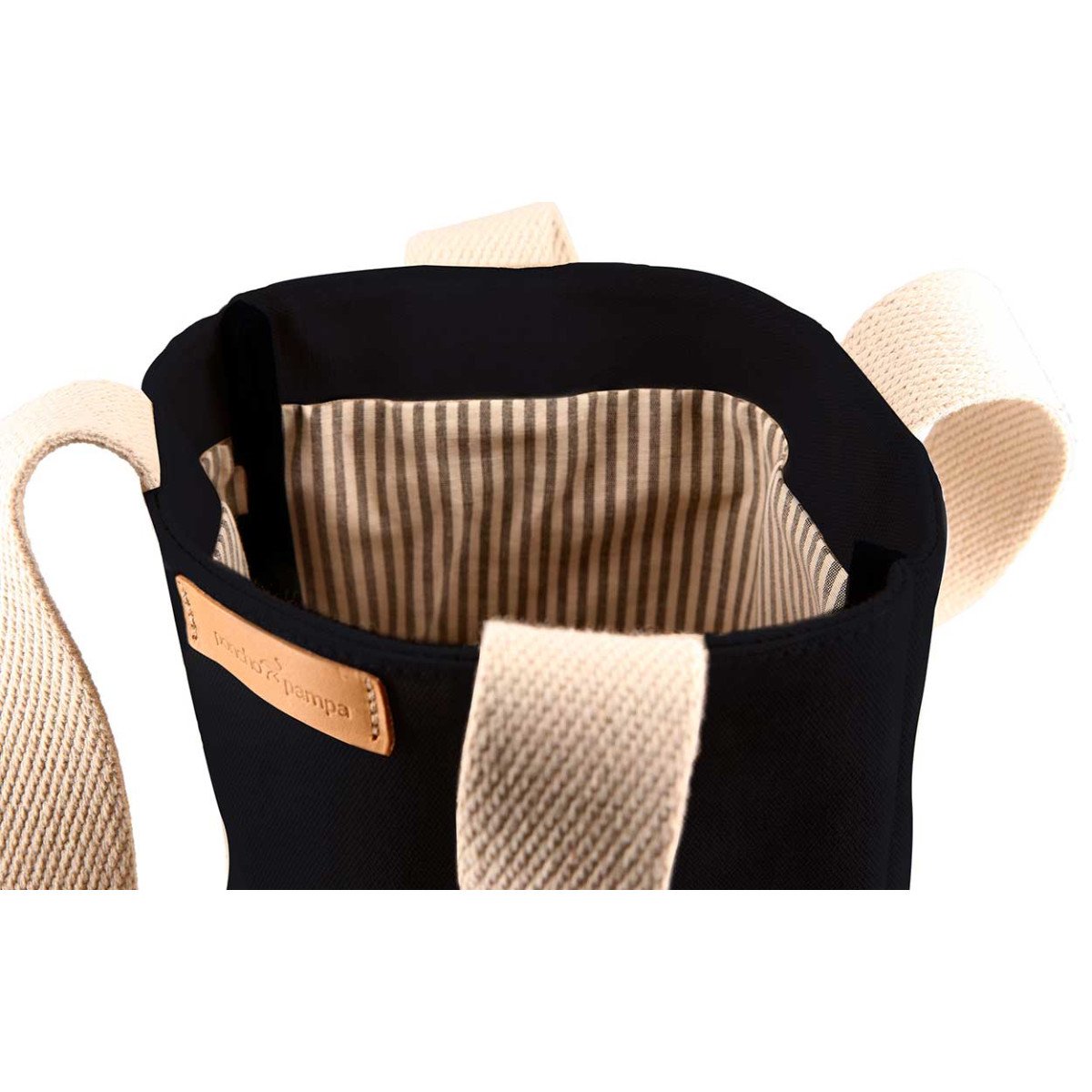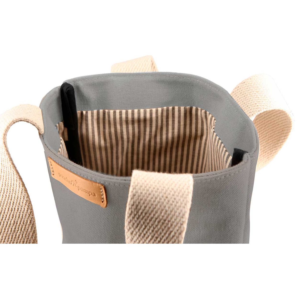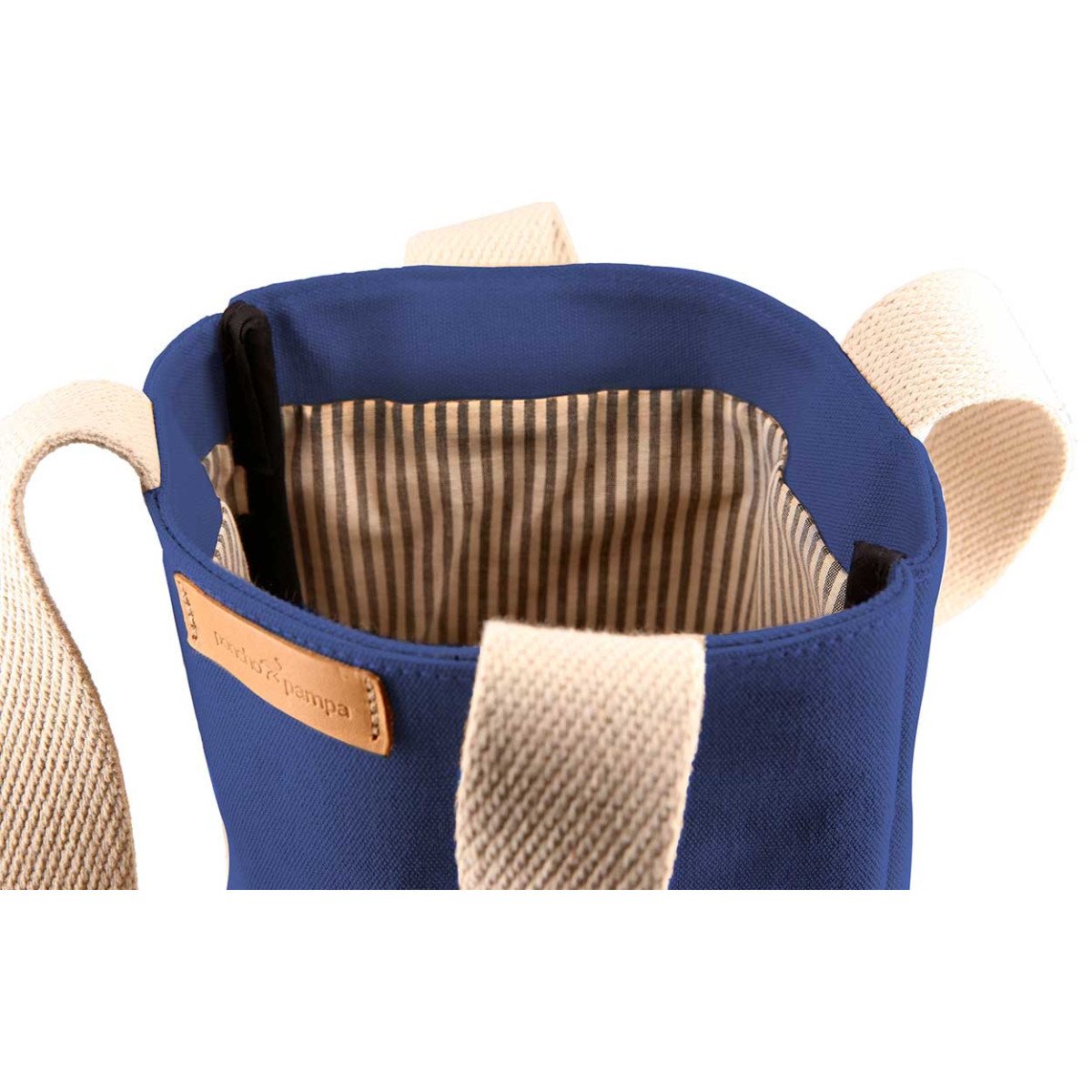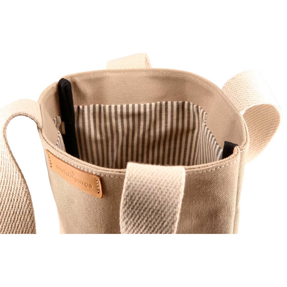 Bolsa Matera realizada en Loneta 100% algodón de 510 gr con manijas de cinta de algodón de 30 mm color crudo. En su interior contiene forro rayado de Gros y costuras internas ribeteadas. Capacidad 11,4 lts