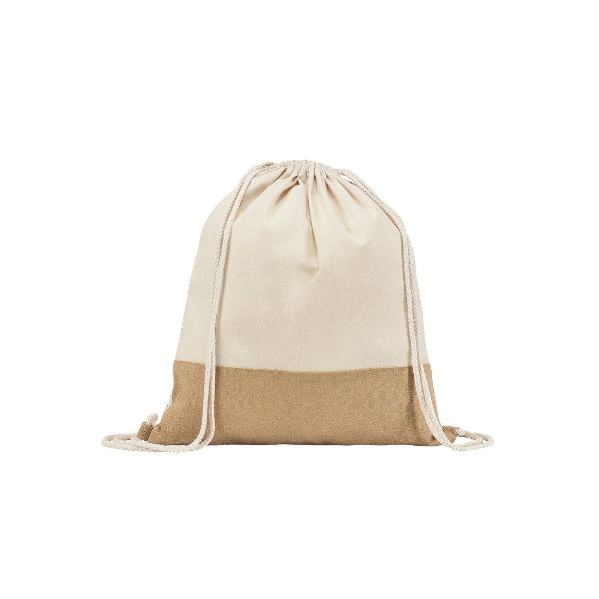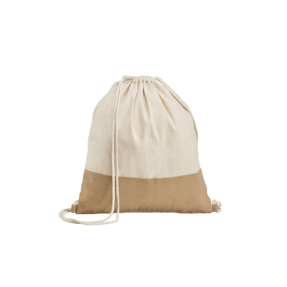 Bolsa tipo mochila de algodón 100% (160 g/m²) con franja en arpillera y cordón de cierre de algodón.