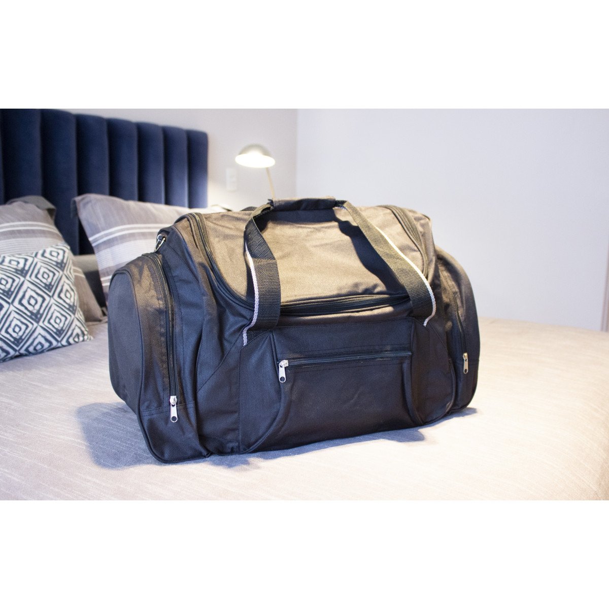 60 x 33 x 29 cm. Capacidad 45 litros aprox. Poliéster 600D. Bolso de viaje o deportivo. Bolsillo frontal y compartimentos laterales externos con cierre. Apertura superior completa con cierre. Herrajes metálicos. Correa regulable y desmontable con hombrera de goma. Manijas con velcro.