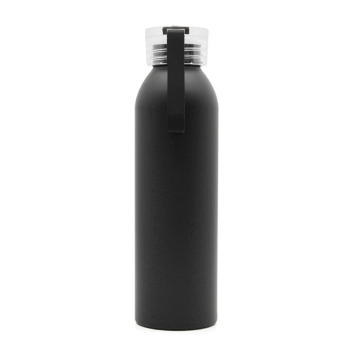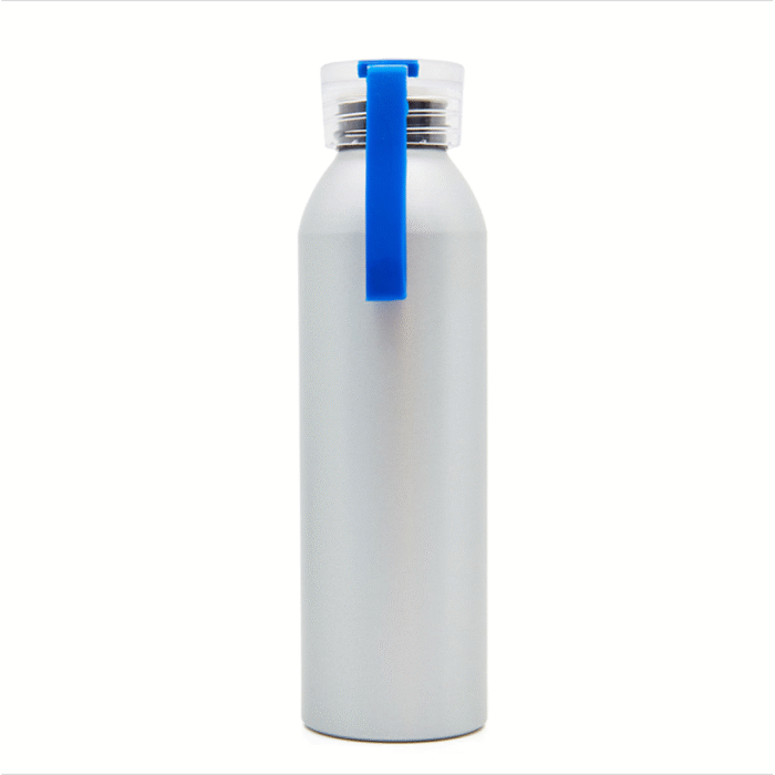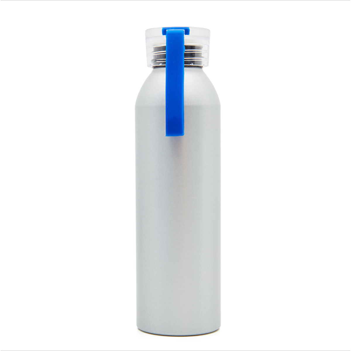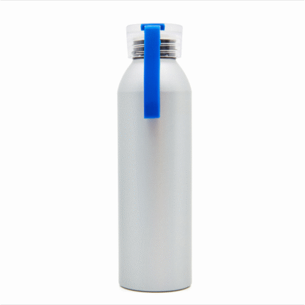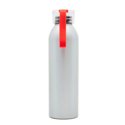 Sport Bottle realizada en aluminio, incluye banda colgante de silicona en colores. Producto aprobado por el I.N.A.L. para el contacto con alimentos. Medidas: 23 cm x diámetro 6,5 cm. Capacidad: 600 ml. Tahg. Producto libre de BPA.