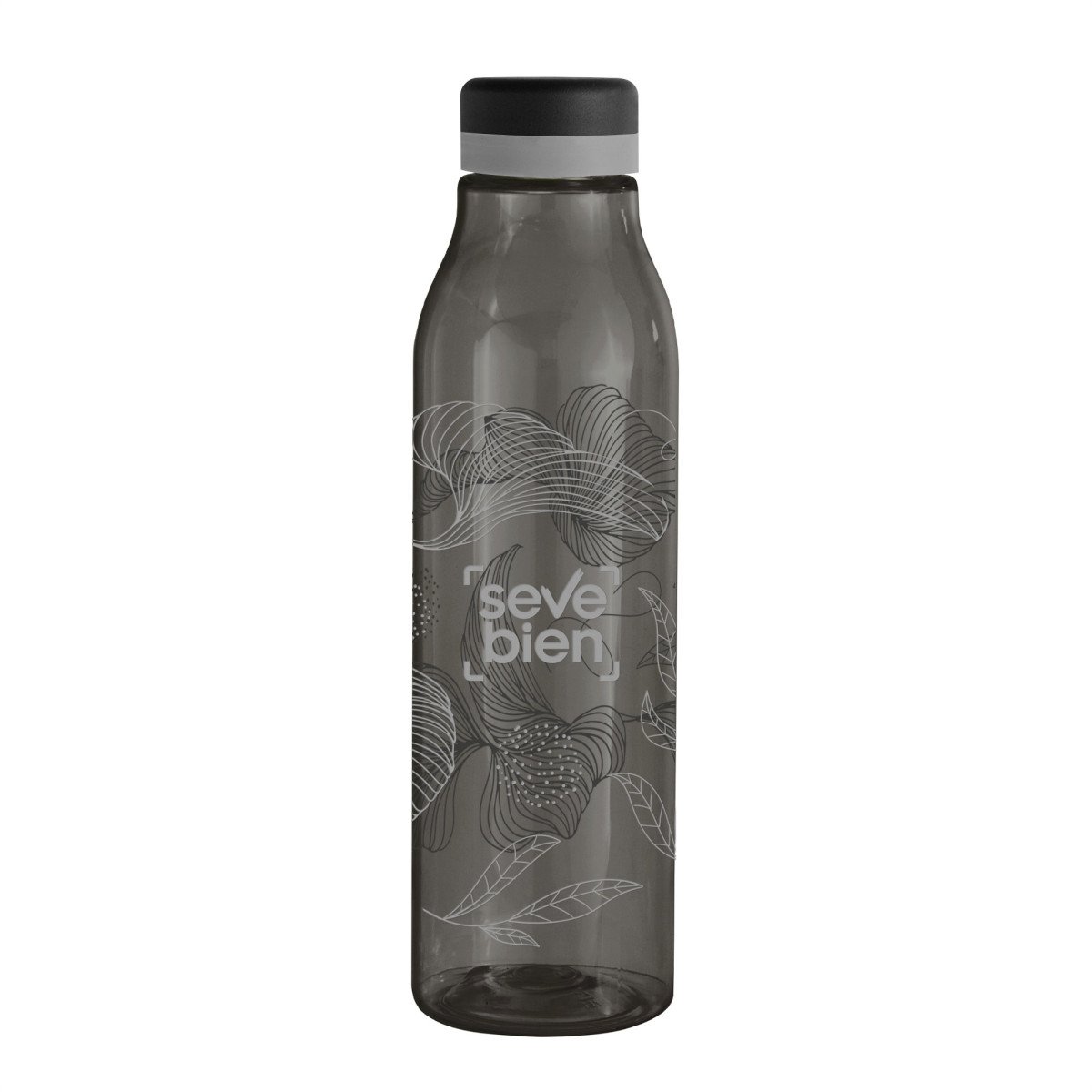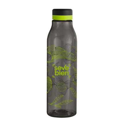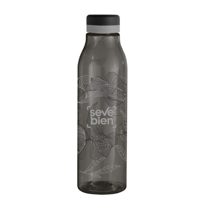 Única en su estilo.Botella de plástico color negro con tapa a rosca color negro mate con anillo de silicona de diferentes colores.Medidas: Ø 7 x 24,5 cm.