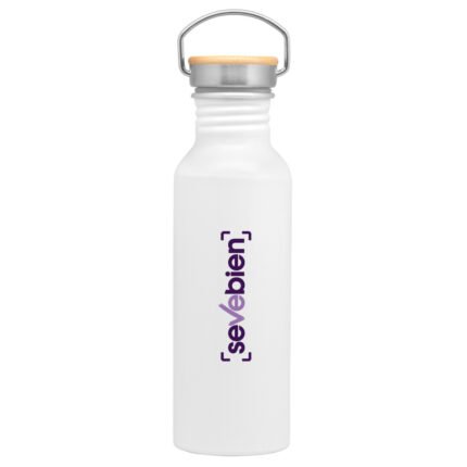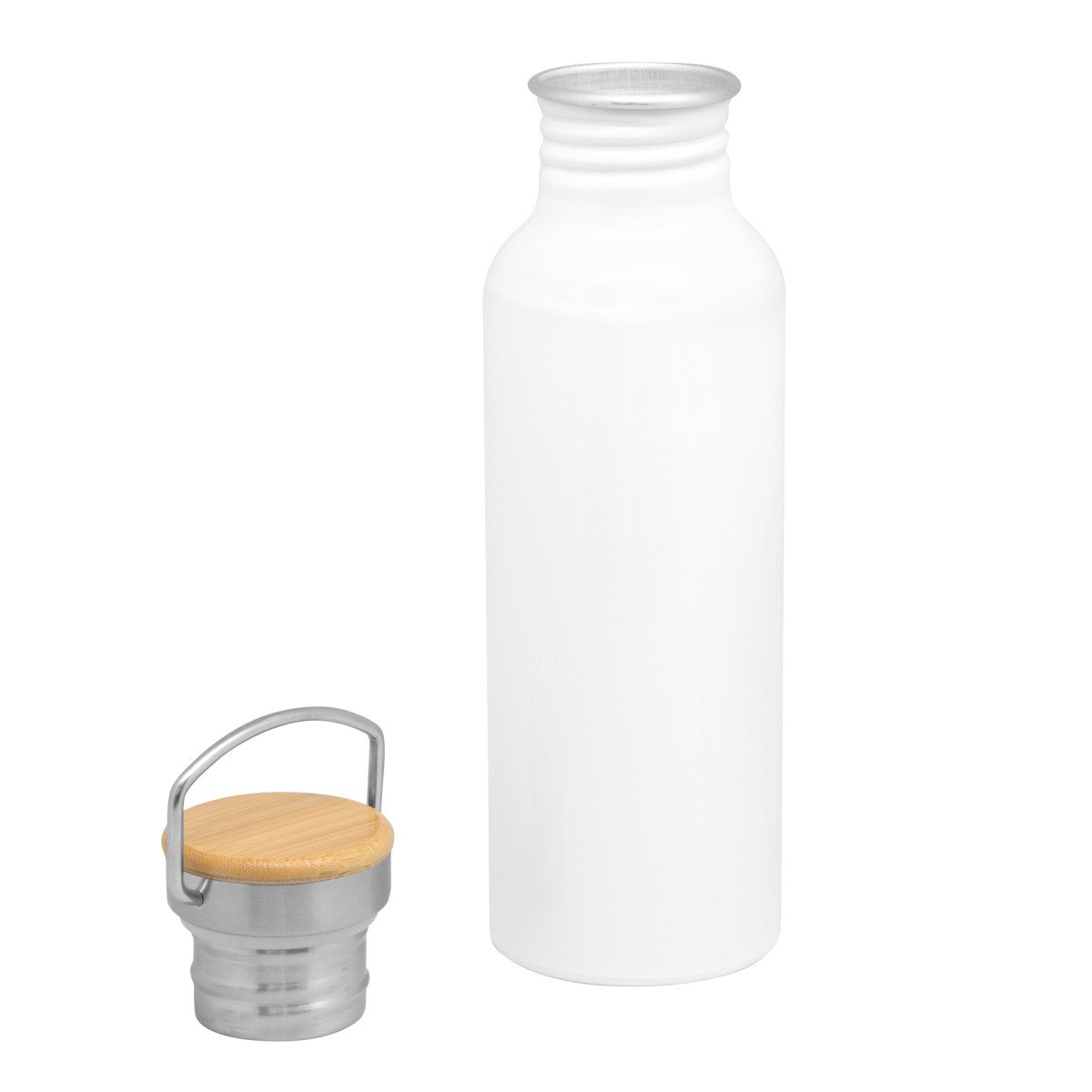 Ø 7,3 x 24 cm. Capacidad 750 ml. Aluminio. Tapa de acero con manija metálica rebatible y detalles en bambú. Anillo de silicona antiderrame. Presentación en caja de regalo Kraft