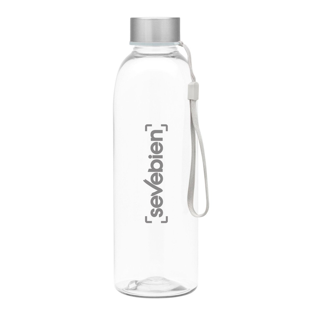 Ø 7 x 23 cm. Capacidad 700 ml. Peso de la botella 70 g y de la tapa 15g. Material PET Cristalino. Botella de plástico transparente con tapa a rosca de acero inoxidable, anillo de silicona antiderrame y correa para transportar. ATENCIÓN Botella y tapa se entregan por separado. / No utilizar con bebidas gaseosas ni líquidos calientes. / El manejo de este producto es delicado. / No exponer al sol y temperaturas altas por tiempo prolongado.