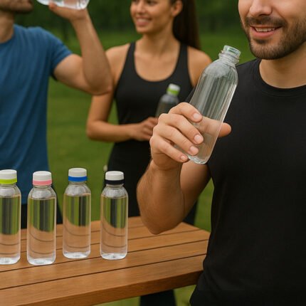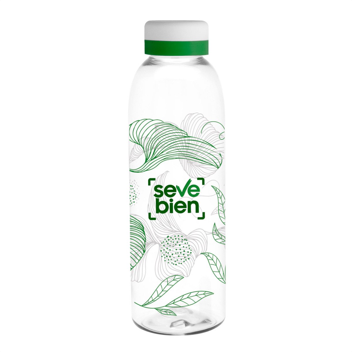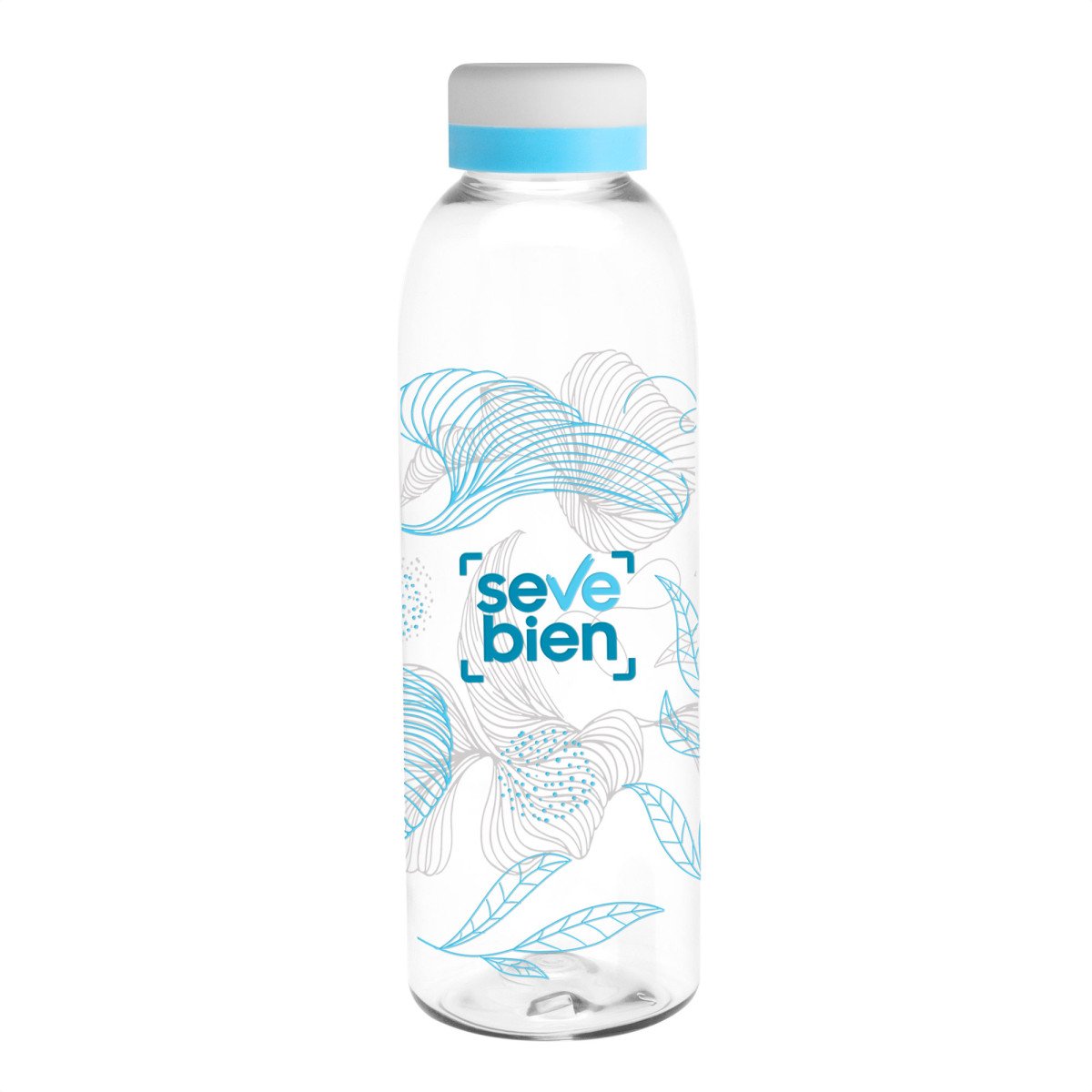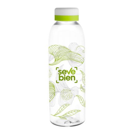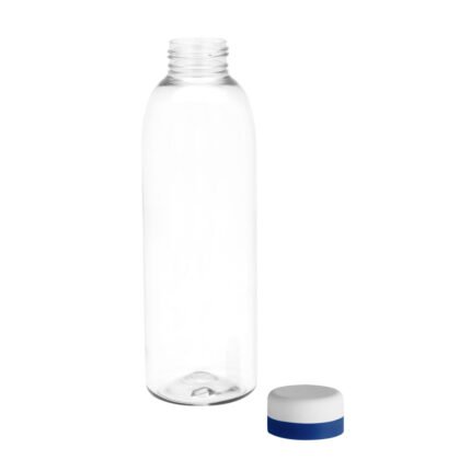 Ligera, práctica y fácil de identificar.Botella de plástico transparente con tapa a rosca color blanco mate con anillo de silicona de diferentes colores.Medidas: Ø 7 x 23 cm.