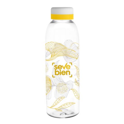 Materiales: PET Cristalino.  ATENCIÓN  Botella y tapa se entregan por separado. / No utilizar con bebidas gaseosas ni líquidos calientes. / El manejo de este producto es delicado. / No exponer al sol y temperaturas altas por tiempo prolongado.