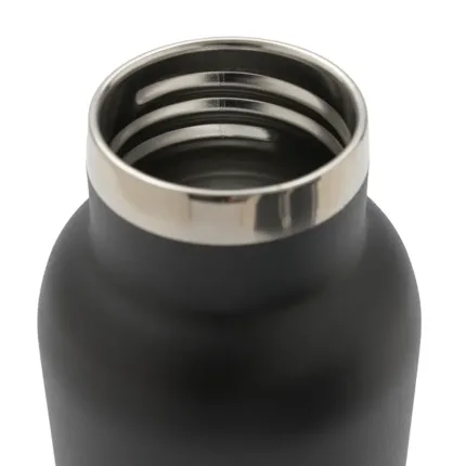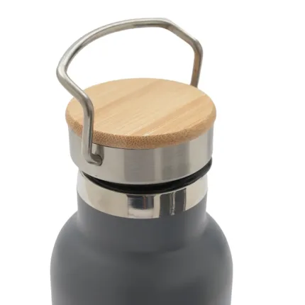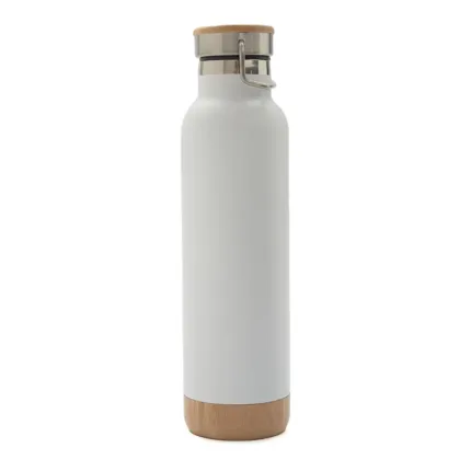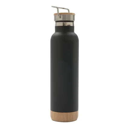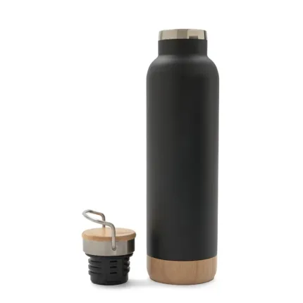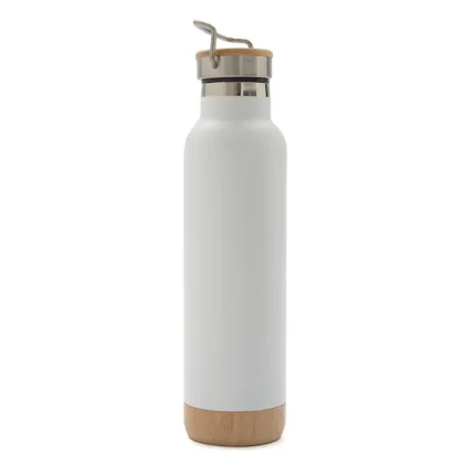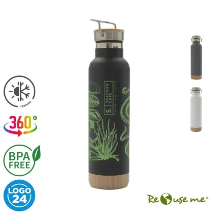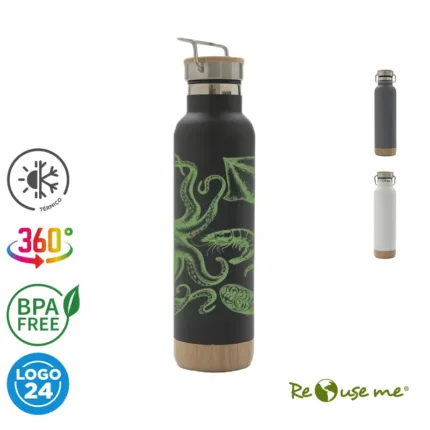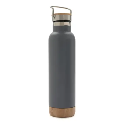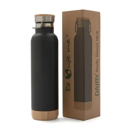 Botella reutilizable de 700 ml de doble pared de acero inoxidable 304, con base de bamboo. Mantiene las bebidas frías por 24 horas y calientes durante 12 horas. Cuenta con tapa a rosca de bamboo y gancho para facilitar su agarre.