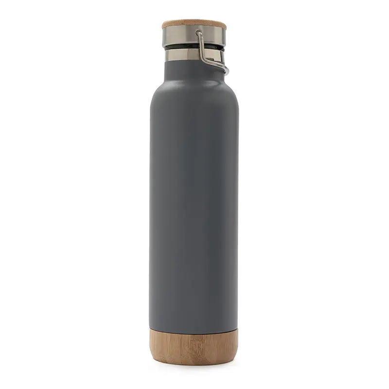 Botella reutilizable de 700 ml de doble pared de acero inoxidable 304, con base de bamboo. Mantiene las bebidas frías por 24 horas y calientes durante 12 horas. Cuenta con tapa a rosca de bamboo y gancho para facilitar su agarre.