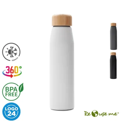 Botella de 500ml fabricada en doble pared de acero inoxidable con tapa a rosca de bamboo. Ideal para el día a día o actividades deportivas. Mantiene las bebidas frías por 8 horas y calientes durante 4 horas. Con impacto positivo en el medio ambiente, esta botella reutilizable te ayuda a reducir el consumo de plástico de un solo uso. Producto libre de BPA, aprobado por el I.N.A.L. para el contacto con alimentos.