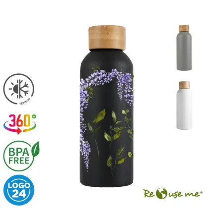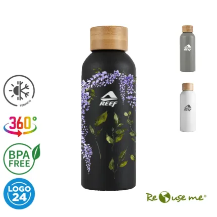Botella de 500 ml confeccionada en doble pared de acero inoxidable con tapa a rosca de bambú. Mantiene las bebidas frías por 24 horas y calientes durante 12 horas.